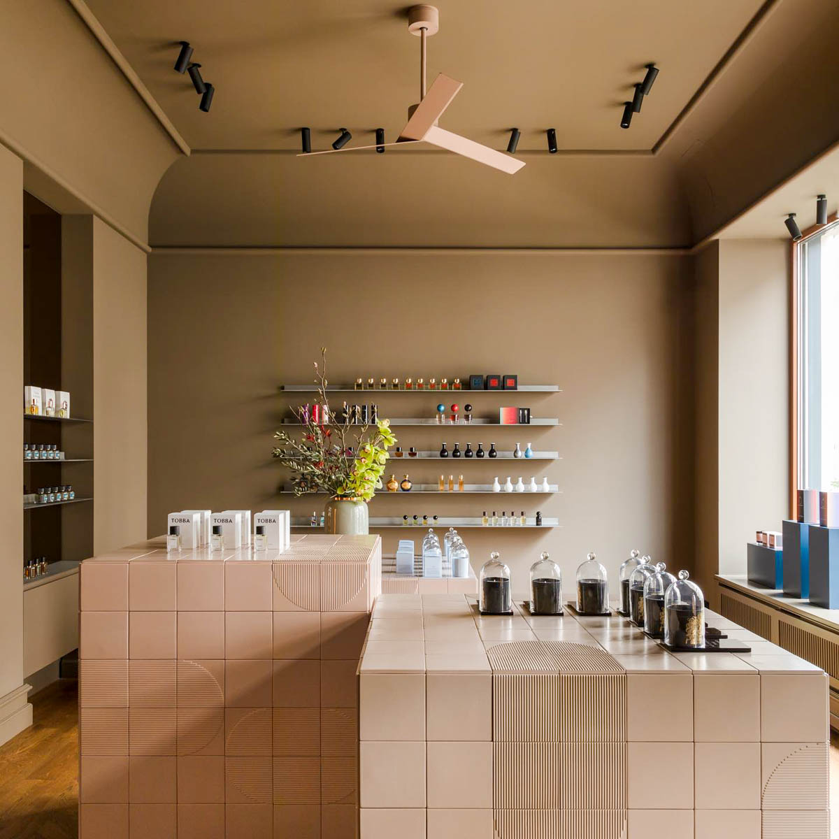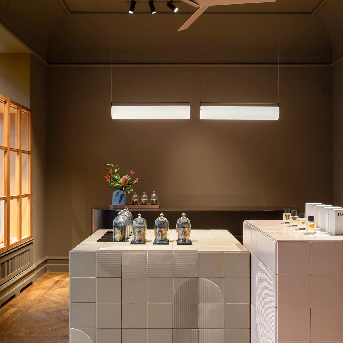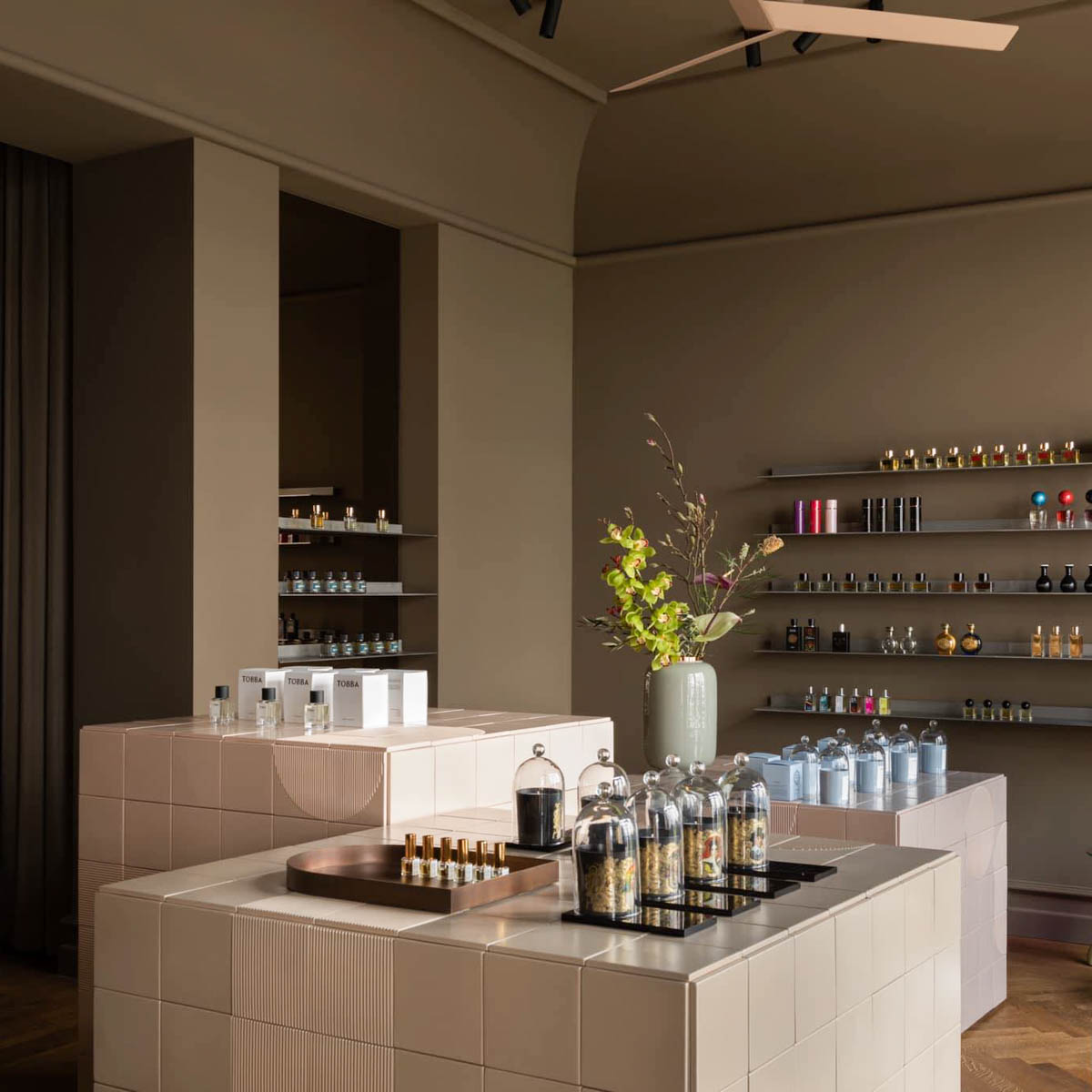 Aufgearbeitetes Eichenparkett, die Wände in einem satten Schlammton, drei mittig platzierte Präsentationskuben, deren pastellfarbige Fliesen als Sonderanfertigung in einer bayerischen Werkstatt gebrannt wurden, zwei niedrige Sessel mit gutlaunigen floralen Stoffbezügen und ein von einem Stuckateur gearbeiteter Deckenabschluss.