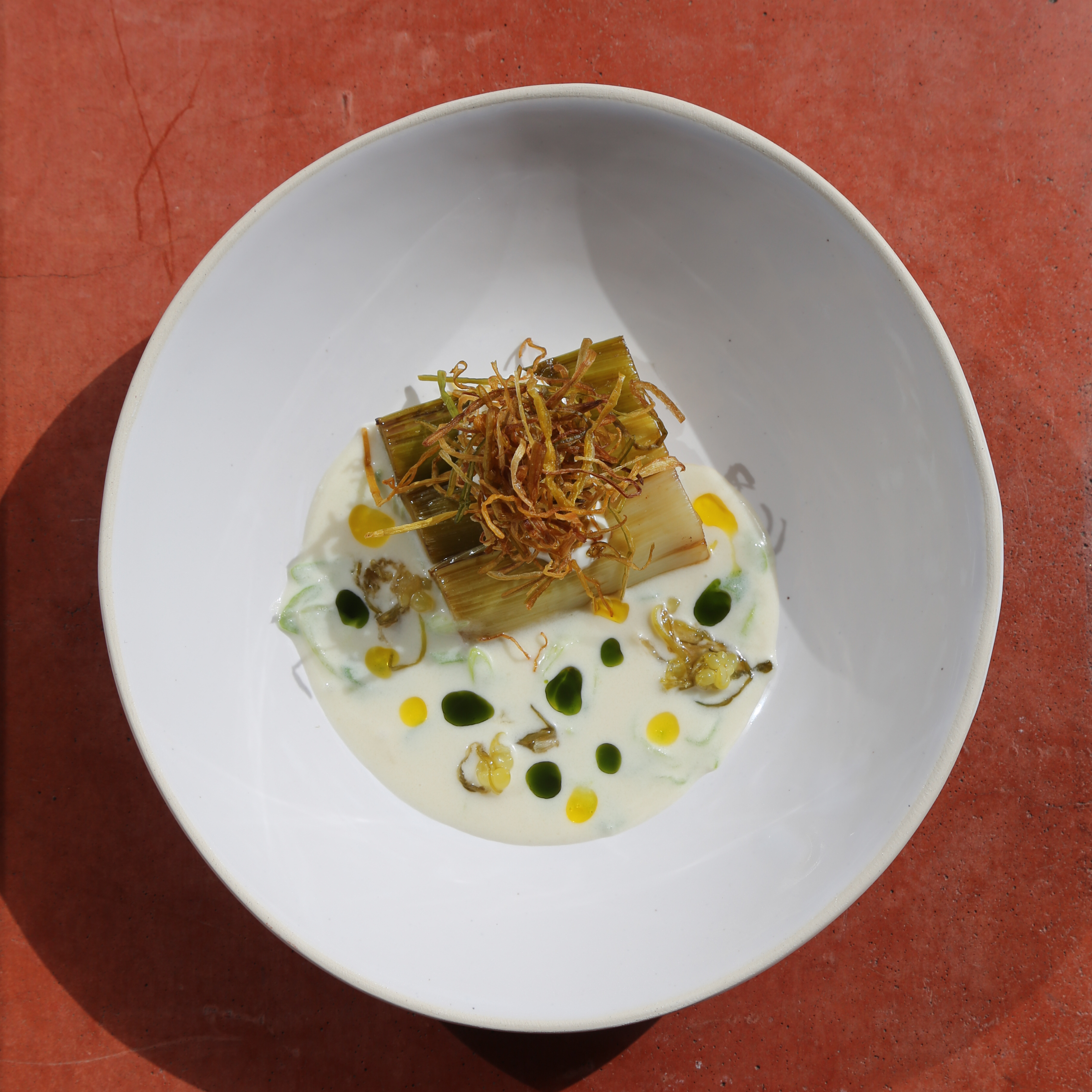 Hervorragend gefallen uns auch die nachfolgenden Gänge, sei es der Saibling mit Buttermilch und in selbstangesetztem Garum eingelegten und danach dehydrierten Saiblingskaviar, der Blumenkohl mit Eigelb und schwarzer Schalotte oder die Kartoffelgnocchi mit Bärlauch und schwarzem Knoblauch. Allen gemein ist, dass sie vor intensiven Aromen nicht zurückschrecken, darüber aber ihre Balance nie verlieren. Und sie stehen alle mit einem Bein noch im Winter, mit einem Bein schon im Frühling. April ist draußen, April ist es auf dem Teller.