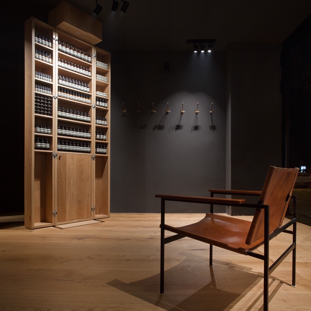 Warmes Eichenholz ist in diesem zweiten Signature Store Berlins das dominierende Element. Als breite Dielen am Boden, an den Wänden und in Form raumhoher Säulen, die sich jede wie ein Schrank öffnen lassen. Sie verbergen bei Nacht, wenn sie geschlossen sind, die zahllosen Cremes, Tinkturen und Seifen, die es bei Tage von den Kunden zu entdecken gilt. Wie ein stilisierter Wald wirkt der Laden dank seines milden Lichts, den natürlichen Düften und dem zarten Nebel, der dann und wann aus runden Öffnungen im Verkaufstresen aufsteigt.