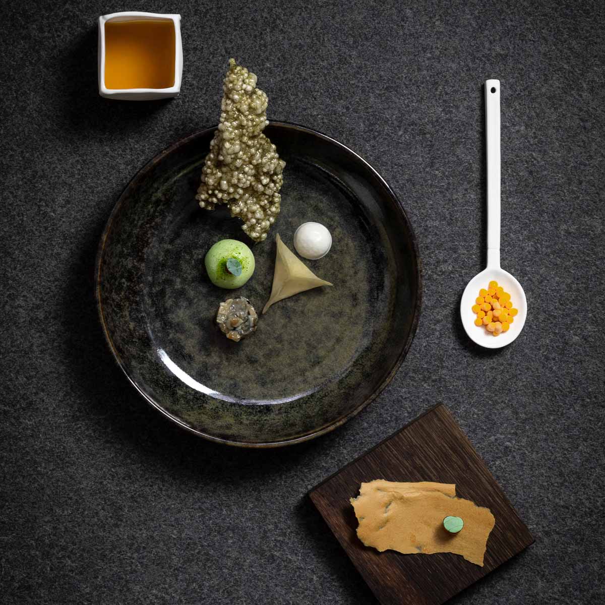 Er und sein Team haben den Lockdown ganz offensichtlich nicht dazu genutzt, auf der faulen Haut zu liegen: mit Gerichten wie Rettich mit Lardo, schwarzem Knoblauch und Bockshornklee oder Nierenzapfen mit Rauchkartoffeln demonstriert man hier Mut zu starken Kontrasten und Fingerspitzengefühl in feinen Nuancen.