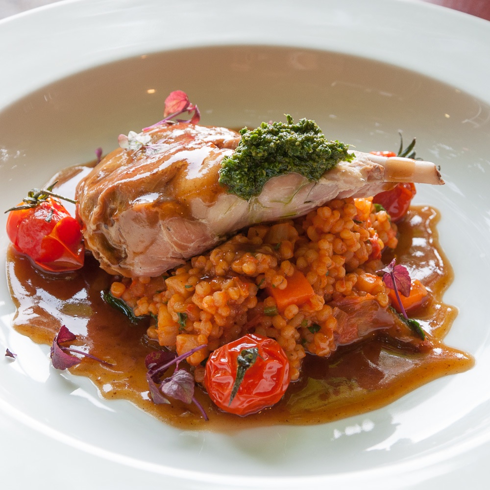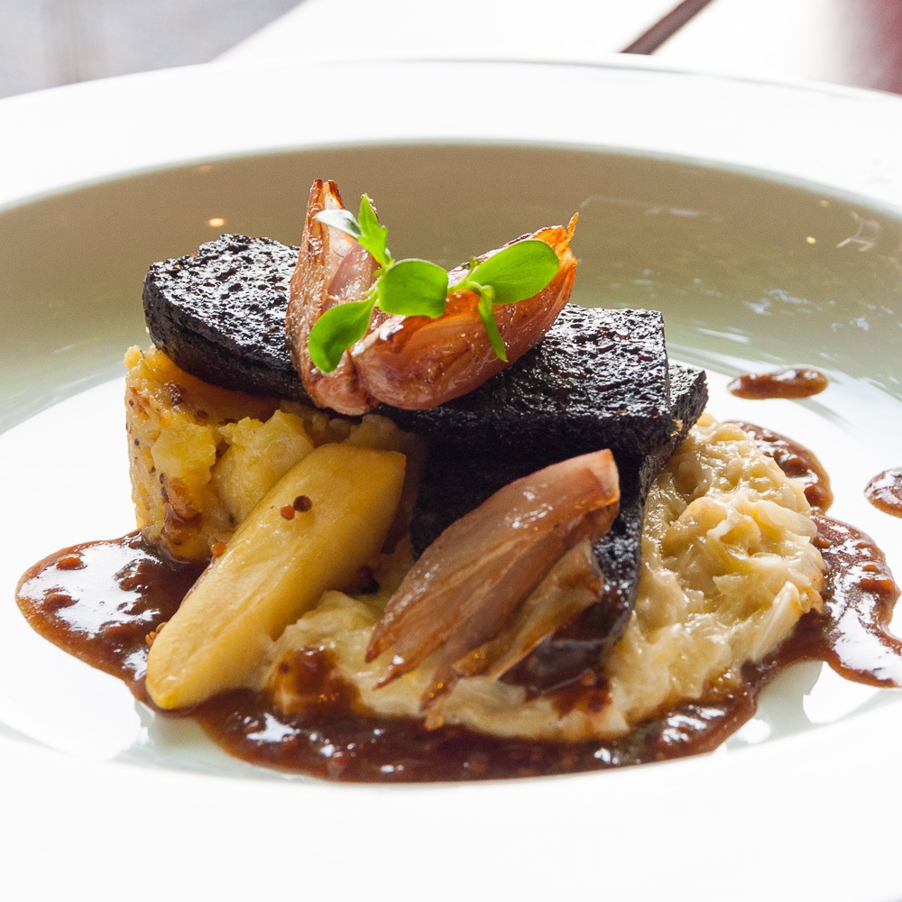 Die Portionen sind ländlich üppig und es dauert eine ganze Weile, bis auch die überaus schmackhaften Hauptgerichte - "Geschmorte Kaninchenkeule mit Speck, Salbei und Graupen-Gemüse-Risotto" sowie "Brandenburger Ente mit Blumenkohl und Kartoffelküchlein" - vertilgt sind. Aber es bleibt nichts übrig, einfach zu gut schmecken Fleisch und Beilagen.