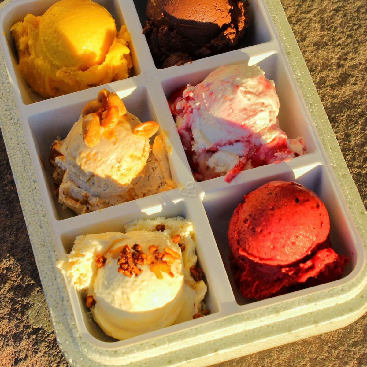 Neben traditionellen Sorten wie Vanille und Stracciatella gibt es auch ausgefallene Geschmacksrichtungen wie „Blütenhonig-Walnuss-Zimt“, die ausschließlich mit Honig gesüßt wird, oder „La Crema Artigiani“, eine Kombination aus Mascarpone, Zitrone und Orange. Für Experimentierfreudige empfehlen wir das „Olivenöl-mit-Rosmarin“-Eis, das wir extrem spannend und gelungen fanden.