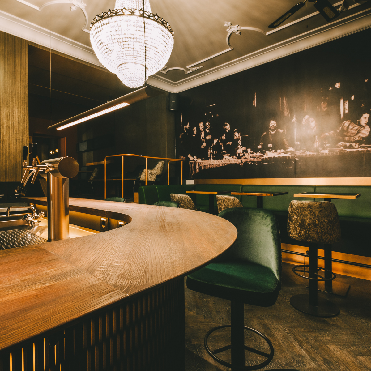 Die Atmosphäre? Gedämpft, warm und charmant unaufgeregt. Neben klassischen Barhockern gibt es samtbezogene Stühle im 50er Jahre Stil und mit grünem Leder bezogene Bänke an schwarz-glänzenden Tischen. Ein großer Kronleuchter sorgt für mildes Licht. Nicht laut, nicht überinszeniert. Stattdessen echtes Bar-Feeling.
