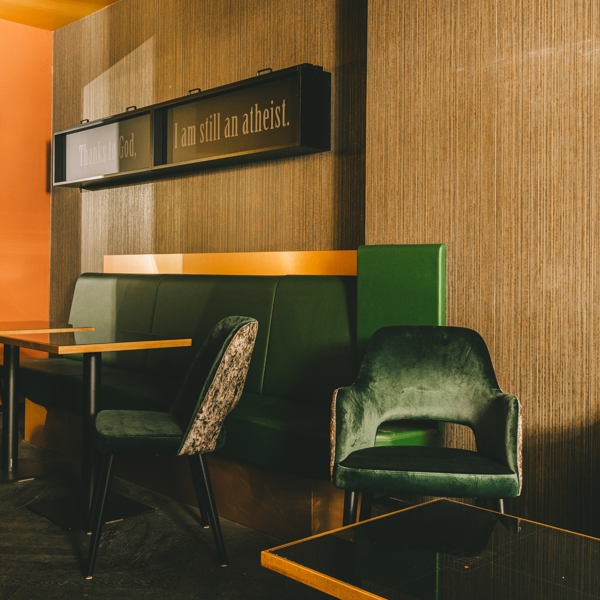 Hinter der Bar: ein kleines Team mit großem Verständnis für Barkultur. Auf der Karte: klassische Cocktails und spannende alkoholfreie Alternativen sowie sorgfältig ausgewählte Weine und Longdrinks mit cineastischem Augenzwinkern. Der „Buñueloni“ ist längst ein Signature Drink, der Martini wird auf Wunsch exakt so trocken serviert, wie der Namensgeber ihn mochte – mit einer Zitronenzeste und einem Hauch Wermut. – Nothing else.
