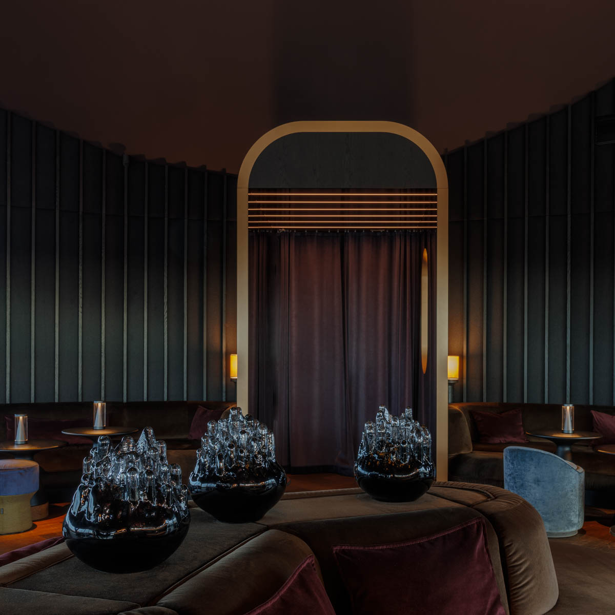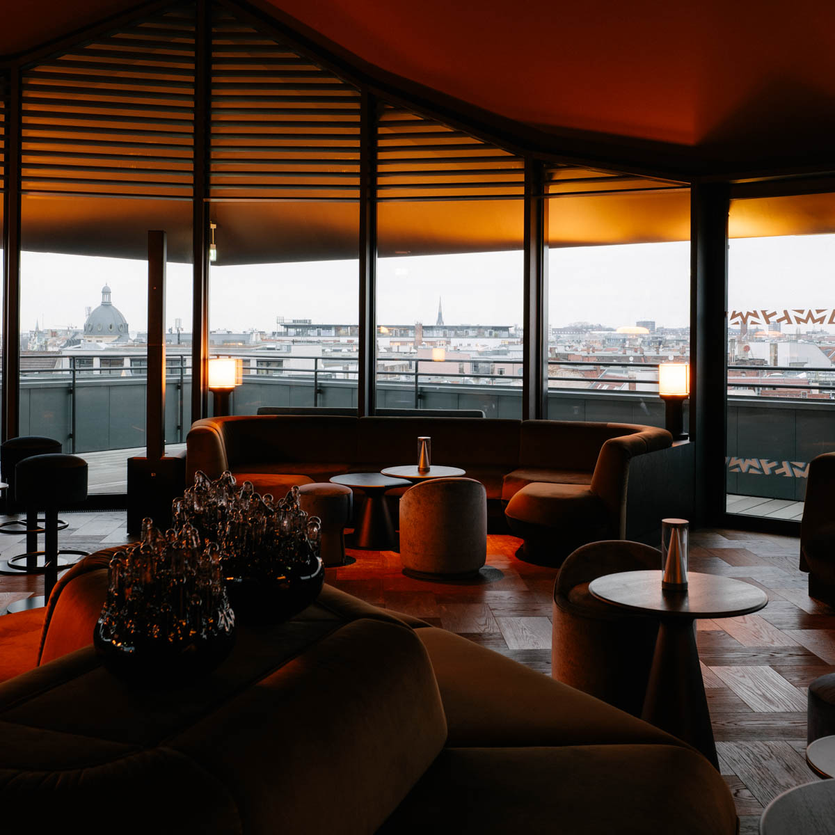 Zu dreiviertel verglast ist zunächst der Ausblick beeindruckend, wenn sich der Vorhang zur Bar Clara öffnet. Gediegen mit dunklem Samt bezogene umlaufende Sofaelemente, davor kleine Tischchen und elegante Hocker. An der Stirnseite die Bar aus Naturstein und Bronze mit einer ganzen Reihe an Barkeepern in schwarzen Outfits der Berliner Designerin Esther Perbandt. Darüber ein markanter Kronleuchter aus Messing.