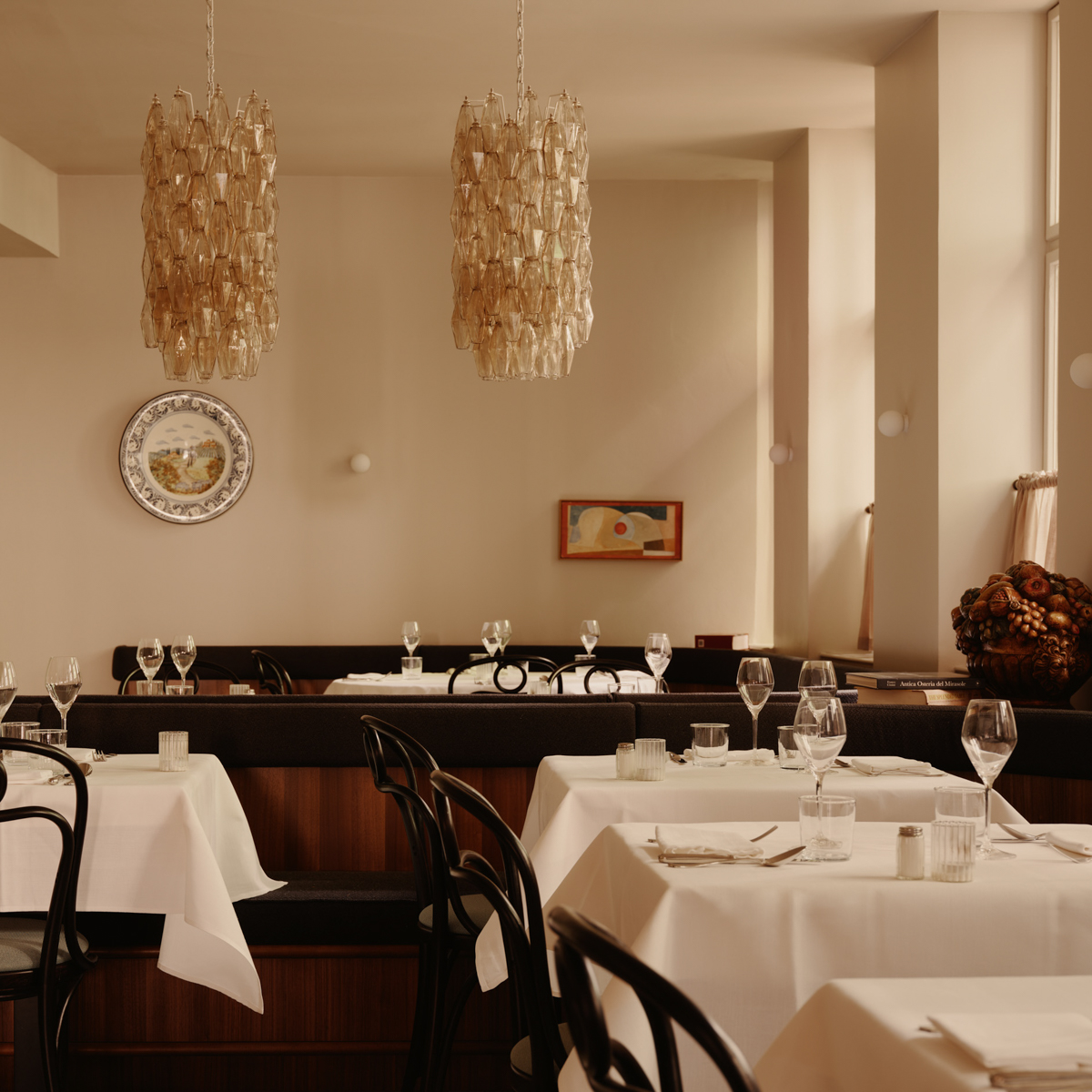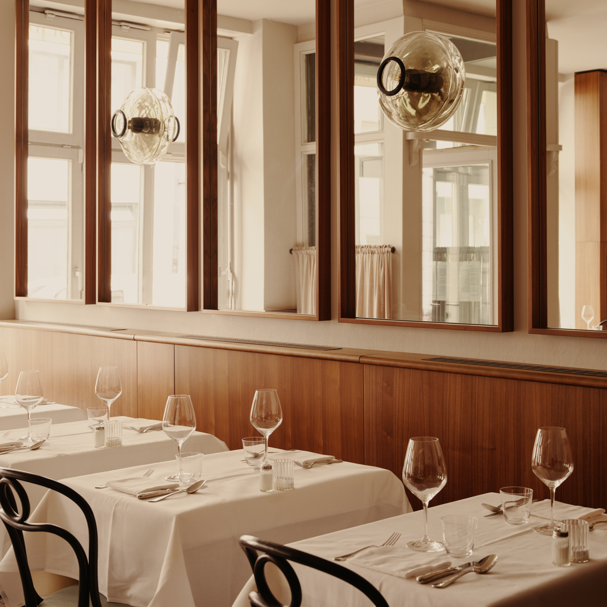 Nun sitzen wir bei schummrigem Licht an weiß eingedeckten Tischen, bestaunen den stylischen venezianischen Kronleuchter aus den 1960er Jahren, die weißen Terrazzoböden und die edle, dunkel gebeizte Wandvertäfelung. Maßgefertigte, rauchige Spiegel schaffen Raum und ein anderthalb Meter langes Regal, in dem Hanses umfangreiche Kochbuchsammlung steht, sorgt für privates Ambiente.