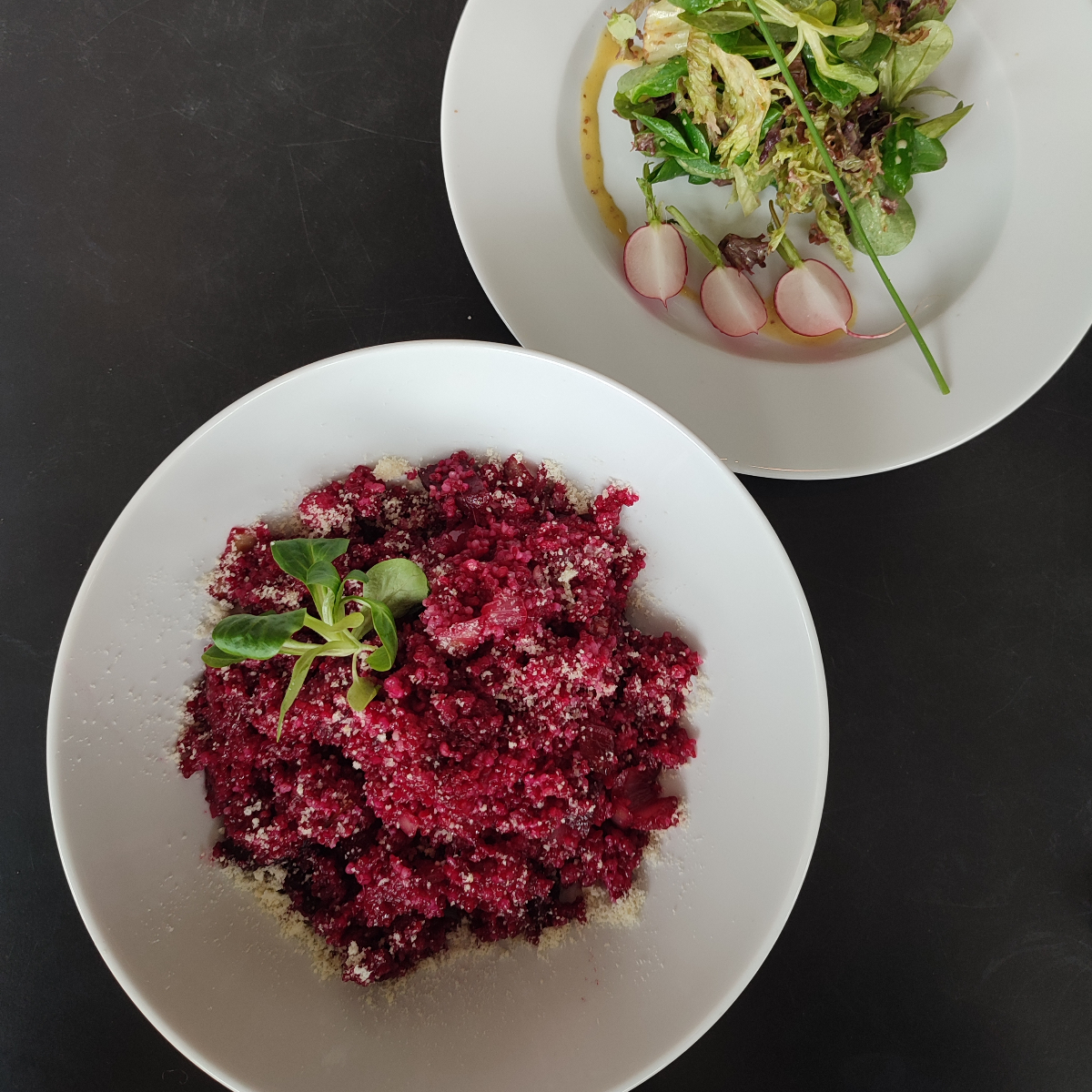 Das heißt natürlich Kaffee und Kuchen – klar – aber auch leckere Quiche, Salat und Sandwiches – und immer auch ein, zwei warme Speisen, die sich an der Jahreszeit orientieren. Risotto etwa, und zwar aus Perlgraupen, statt Reis. „Ich find das viel geiler!“, gesteht Antonio und wir stimmen schon vor dem Kosten des feinen Rote-Bete-Grisottos schwärmerisch zu.