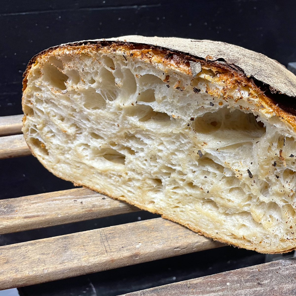 Das Konzept bleibt bewusst reduziert: Im Zentrum steht ein einziges Brot. Basis ist hochwertiges 550er Bio-Weizenmehl, aus dem ein Sauerteig entsteht, der deutlich länger fermentiert als üblich. Die lange Reife sorgt nicht nur für Aroma, sondern macht das Brot auch für viele Weizen-empfindliche Menschen bekömmlicher. – Unbedingt probieren!