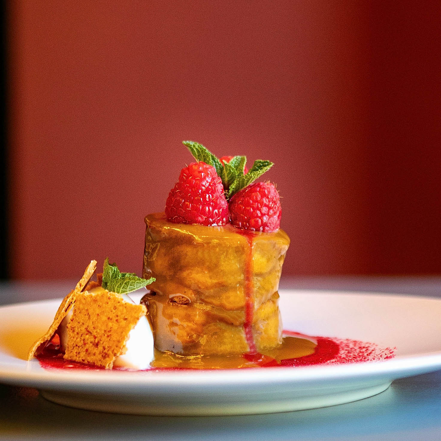 Als leichtes Dessert locken eine Granola Bowl mit Heidelbeersorbet und ein Cheesecake, beide mit frischen Beeren. Es wäre nicht das Bonvivant, wenn nicht irgendwo ein Gimmick auftauchen würde und so bekommt man die Granola in Form eines gepressten Kekses, den man selbst über der Bowl zerbricht.