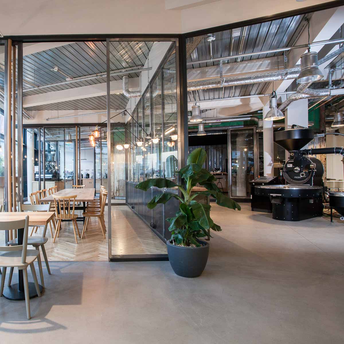 Während man seinen eigenen Kaffee im 19grams genießt, kann man gleichzeitig beim Rösten des hauseigenen Kaffees in der Rösterei zusehen. Zudem gibt es einen Showroom für Profi-Esspressomaschinen und einen Schulungsraum für alle, die mehr über Kaffee und seinen Genuss erfahren wollen. Alle Räume sind durch Glaswände optisch miteinander verbunden.