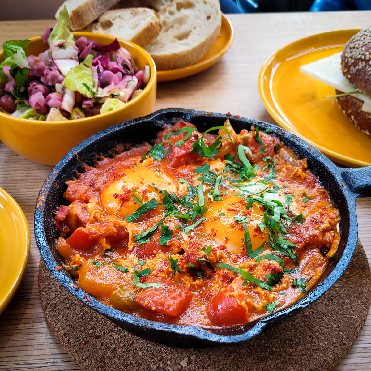 Alles ist hier handgemacht. Idils Mann ist Architekt und gemeinsam haben sie sowohl den Aufbau, als auch die Möbel entworfen und gebaut. Die Rezepte stammen von Idil und teilweise sogar von ihrer Mutter. Ein persönlicher Touch, den man auch schmecken kann. Unter der Woche gibt es Mittagstisch, mit Quiche, Tagessuppe und wechselnden Gerichten, zumeist vegetarisch oder vegan. Am Wochenende gibt es Frühstück, Kaffee und Kuchen und als Special den Grund aus dem wir hier sind: Die Shakshuka.