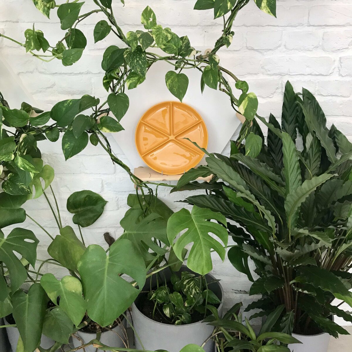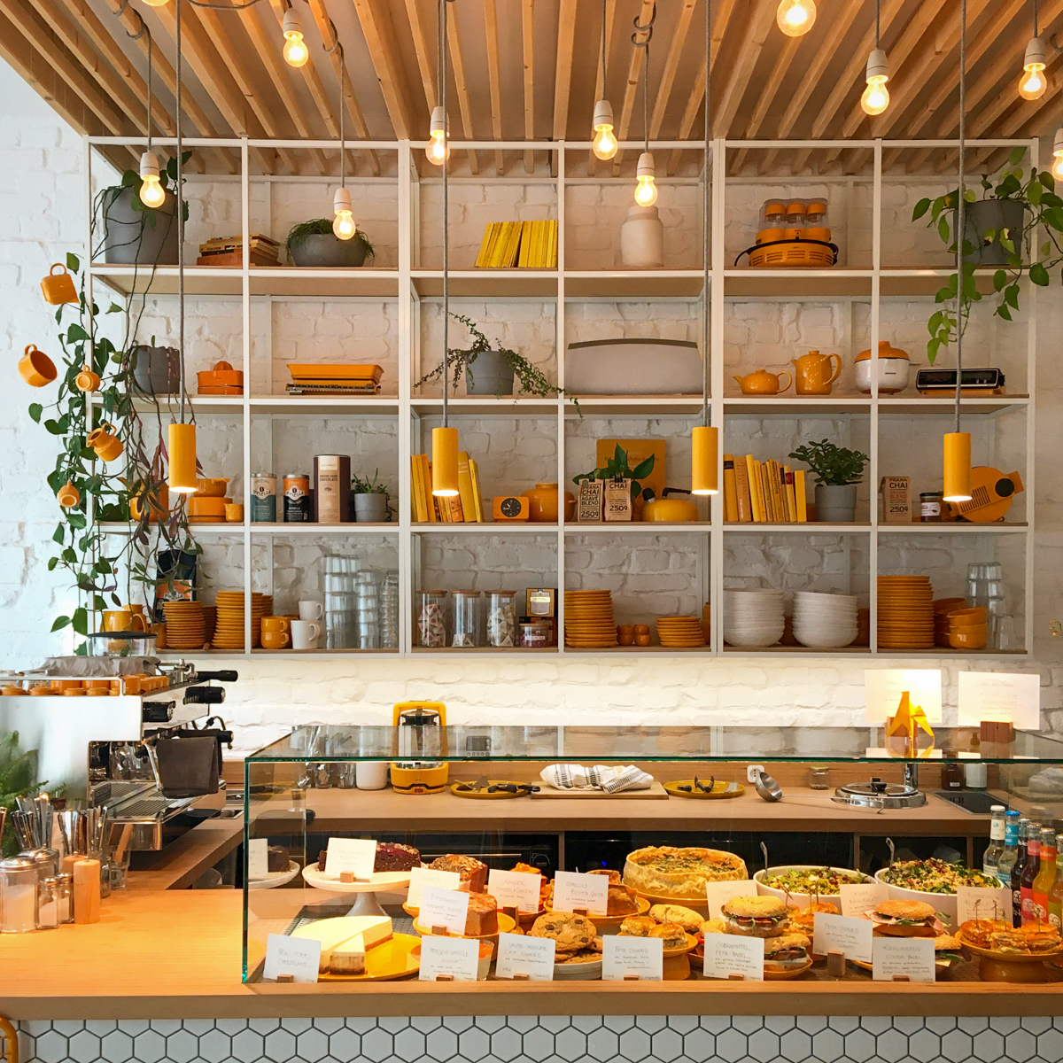 Gelb ist hier namensgebend und vorherrschend. Idil hat im Honiggelb ihre persönliche Sammelleidenschaft für gelbe Gegenstände, vor allem aus den 70ern, auf die Einrichtung übertragen, was in Kombination mit den hellen Wänden und den vielen Pflanzen, eine sehr warme und beruhigende Wirkung hat. Es ist schwer in Worte zu fassen, aber durch die geschmackvolle Farbgestaltung wirkt das Café gleichzeitig makellos rein und einladend. Besonders begeistert optisch die Wand, an der sich eine Kletterpflanze um die honiggelben Accessoires rankt.