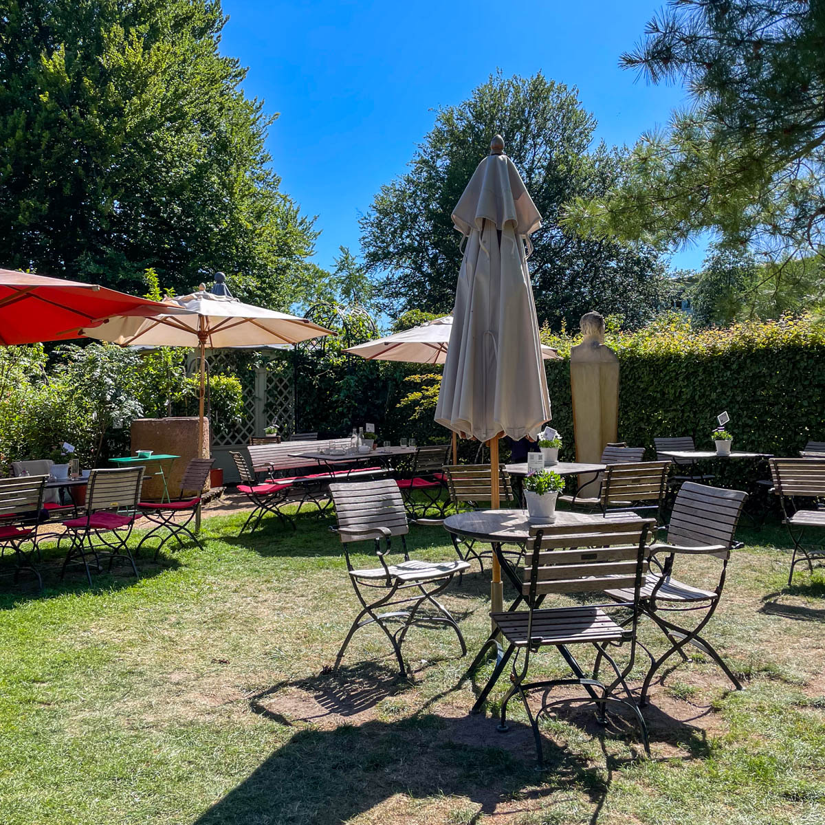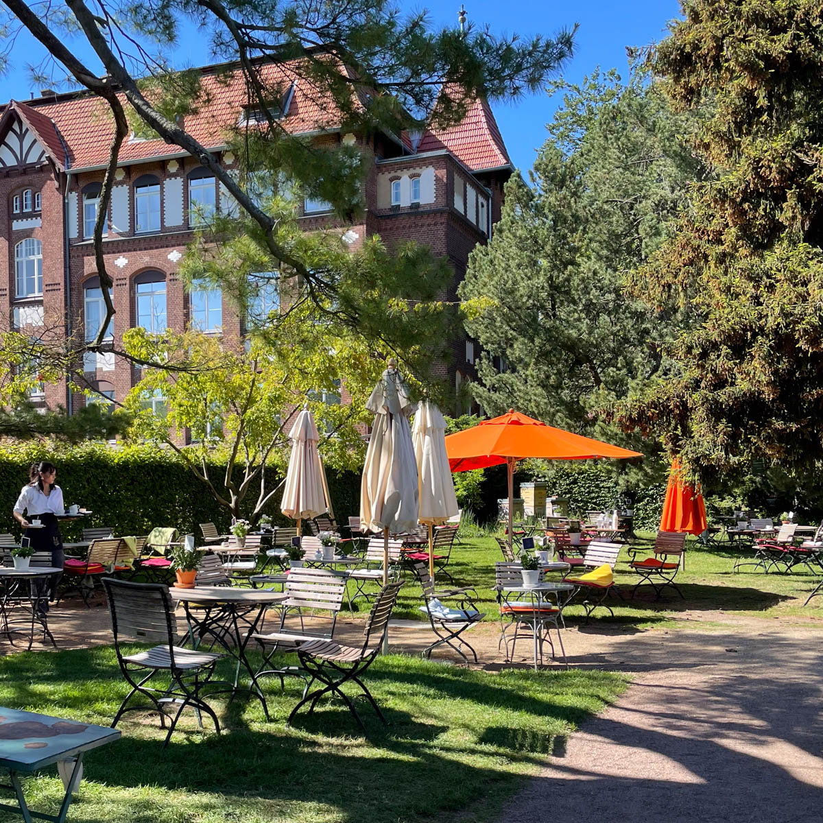 Beschaulicher als in den historischen Gewächshäusern der einst von Peter Joseph Lenné in Potsdam Wildpark gegründeten Königlichen Gärtnerlehranstalt, kann man in Berlin wohl nirgendwo schlemmen. Im Sommer ist der Garten ein verwunschener Ort, an dem es sich unter bunten Schirmen stundenlang verweilen lässt.
