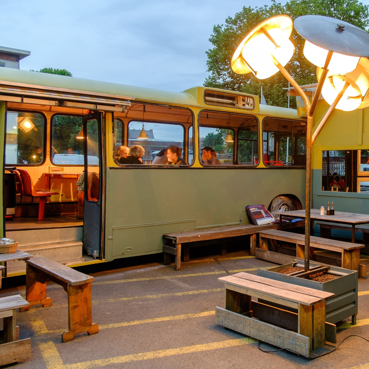 Das Cafè Pförtner befindet sich auf dem Gelände der ehemaligen BVG-Werkstätten, gegenüber den Uferhallen im Stadtteil Wedding. Schon der Name ist Bezug zur Location. Das Cafè befindet sich im alten BVG-Pförtnerhaus und erhält zusätzlichen Charme durch einen alten, zur Lounge umgebauten Stadtbus.