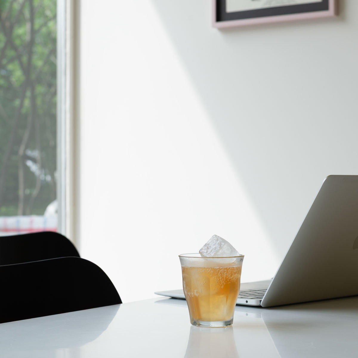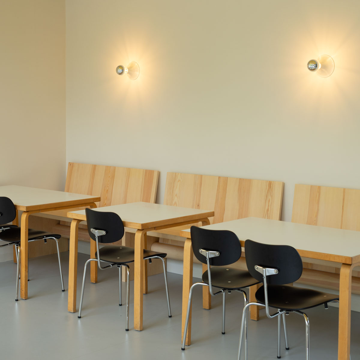 Die denkmalgeschützte Architektur des Hauses prägt bis heute die Atmosphäre des Cafés. Große Fenster öffnen den Raum zum Hansaplatz und zur anderen Seite ins Grüne. Viel Licht fällt hinein, die Einrichtung ist schlicht, hell und unaufgeregt – originale Designklassiker von Alvar Aalto, Artek und Eiermann prägen das Ambiente. Die gelben Markisen über der Terrasse sorgen für warmes Tageslicht.