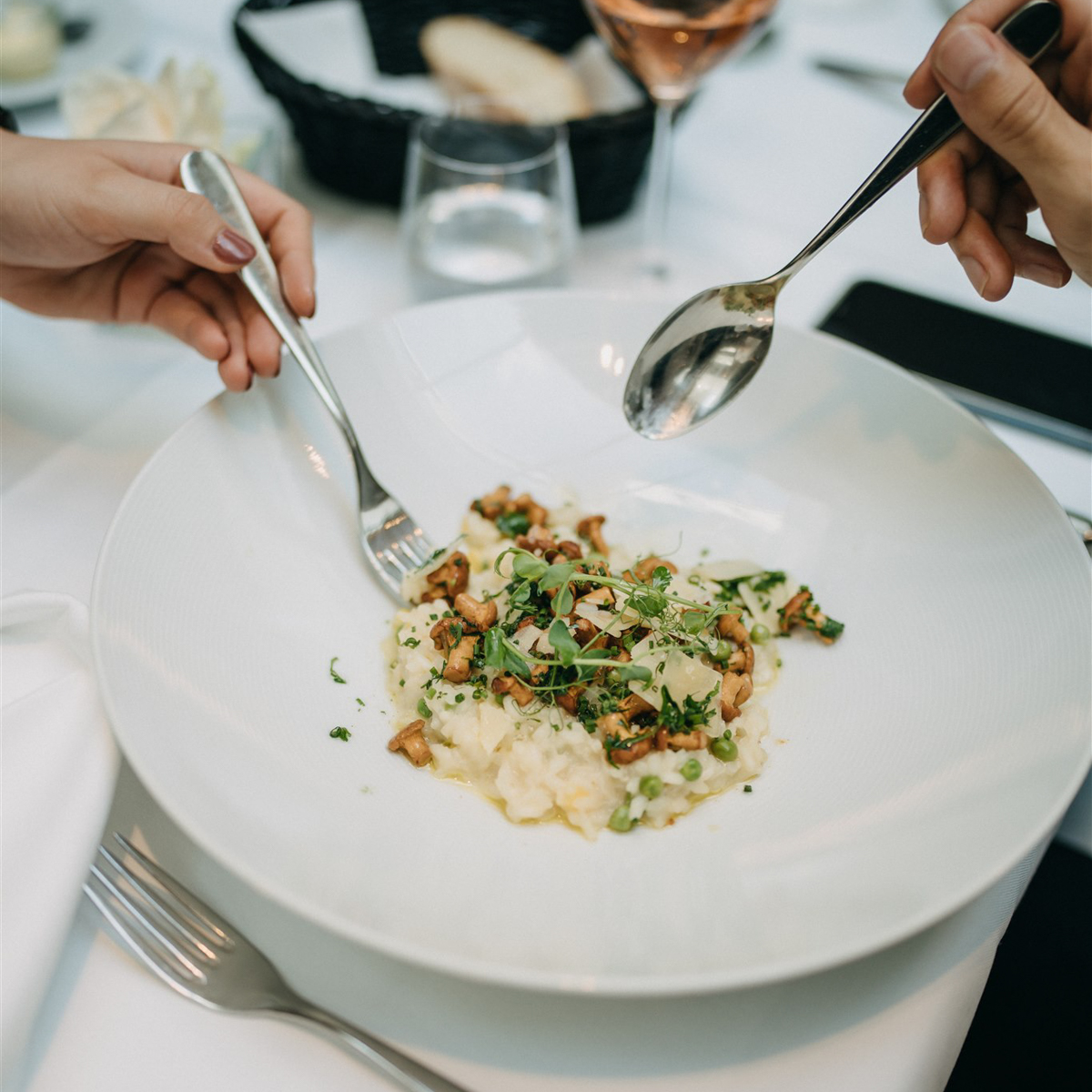 Das gebratene Doradenfilet zum Hauptgang kommt auf einem Zitronen-Basilikum-Risotto mit Artischocke, zarten Courgettes und einem fruchtigen Tomatensud. Ein in sich stimmiger Gang, wie man ihn auch in den eleganten französischen Restaurants an den Promenaden der Côte d’Azur serviert bekommt. Dazu ein Glas Rosé – perfekt!