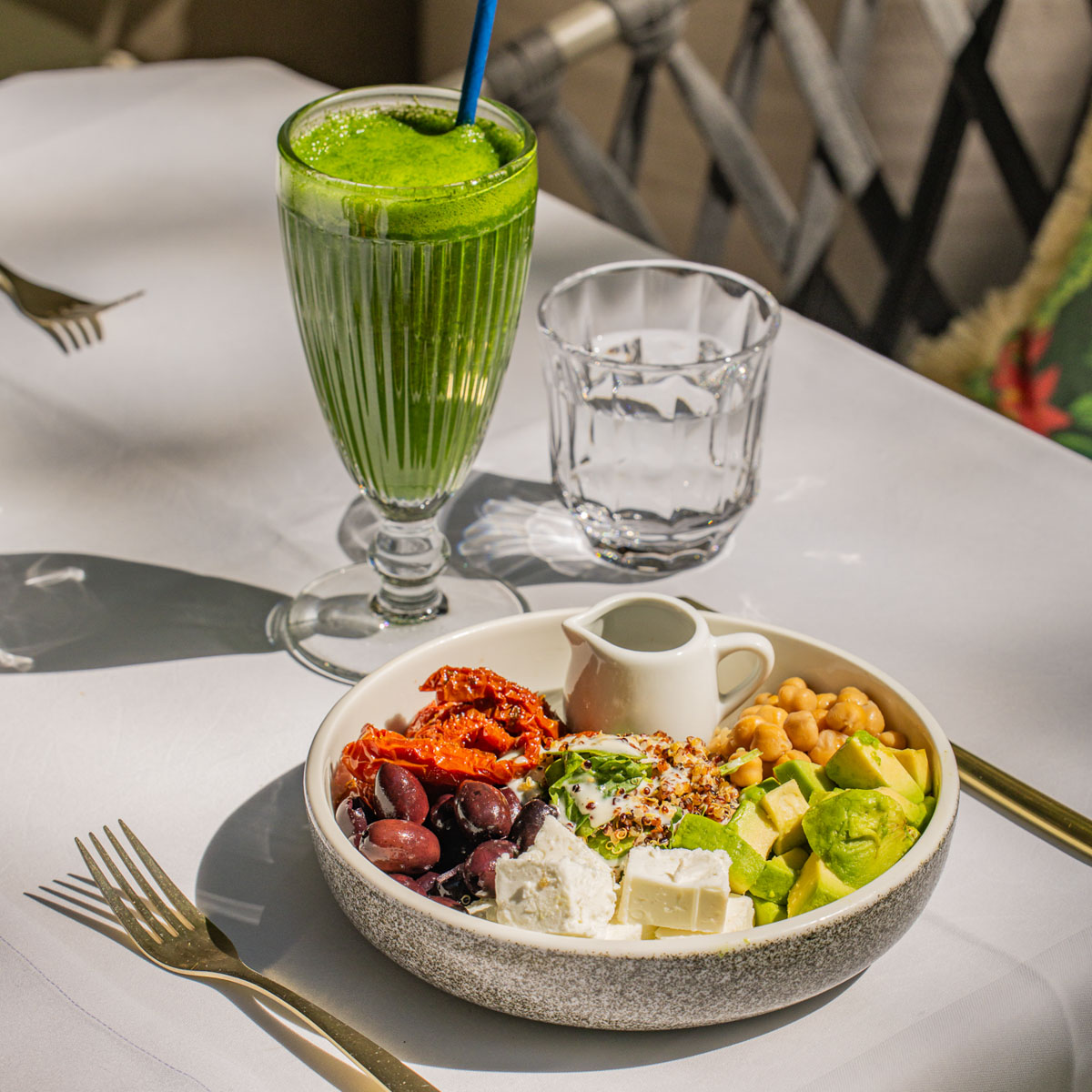Belegte Sauerteigbrote gibt es unter anderem mit Burrata und Feige oder Lachs-Tatar Japanese Style. Es ist fast unmöglich, sich zu entscheiden. Auch die angesagten Egg-Dropp-Toasts in diversen Variationen fehlen nicht. Wir haben es allerdings auf die Healthy Bowls abgesehen: Die „Green Detox“-Version mit Sushi-Reis, gedämpftem Brokkoli, Edamame, Zucchininudeln, Avocado, Gurke, gerösteten Mandeln und Limetten-Tahini-Dressing soll es sein – dazu ein Stück gebratener Lachs.
