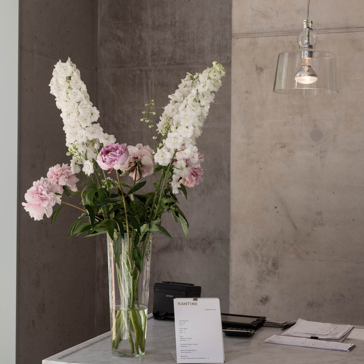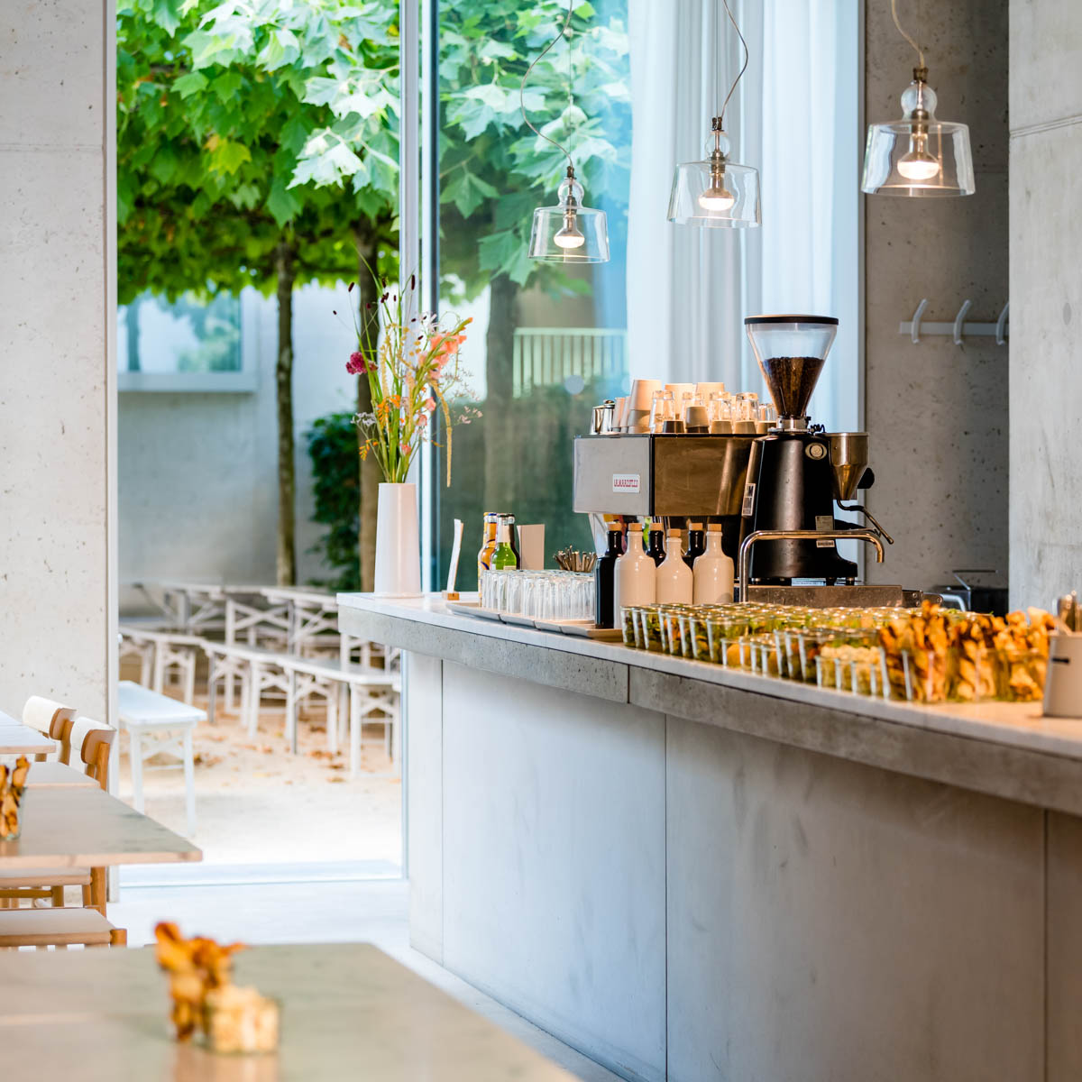 Doch auch das 2013 erbaute Kantinengebäude kann sich sehen lassen, mit seinen lichtdurchfluteten Räumen von schlichter Schönheit aus Beton und Holzt. Holz. Aufgezogen hat die Kantine in Zusammenarbeit mit David Chipperfield Architects Maren Timm, Betreiberin des Restaurants Lokal. Inzwischen wird die Kantine in Eigenregie des Architekturbüros betrieben, unter der Führung von Jonas Hoffmann.