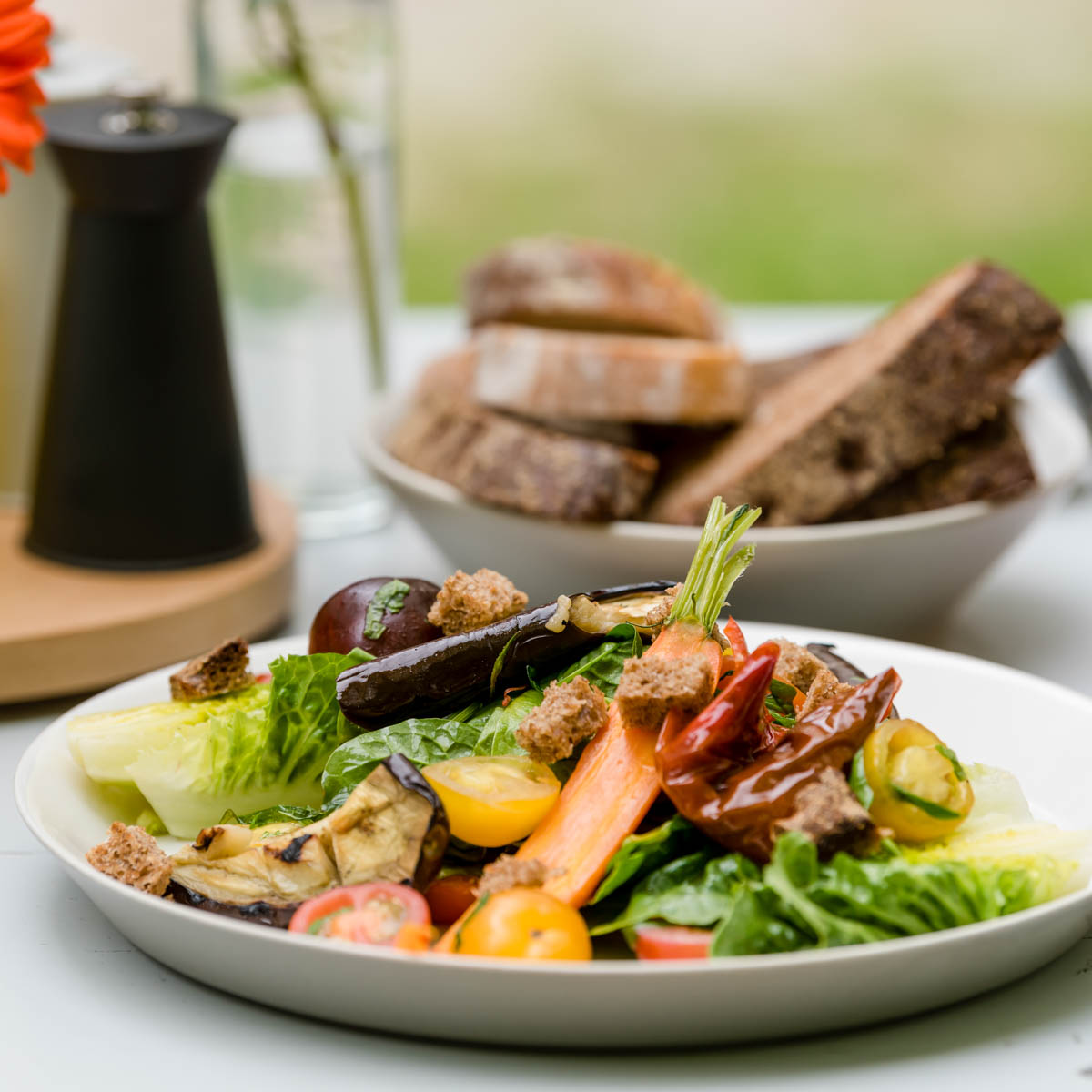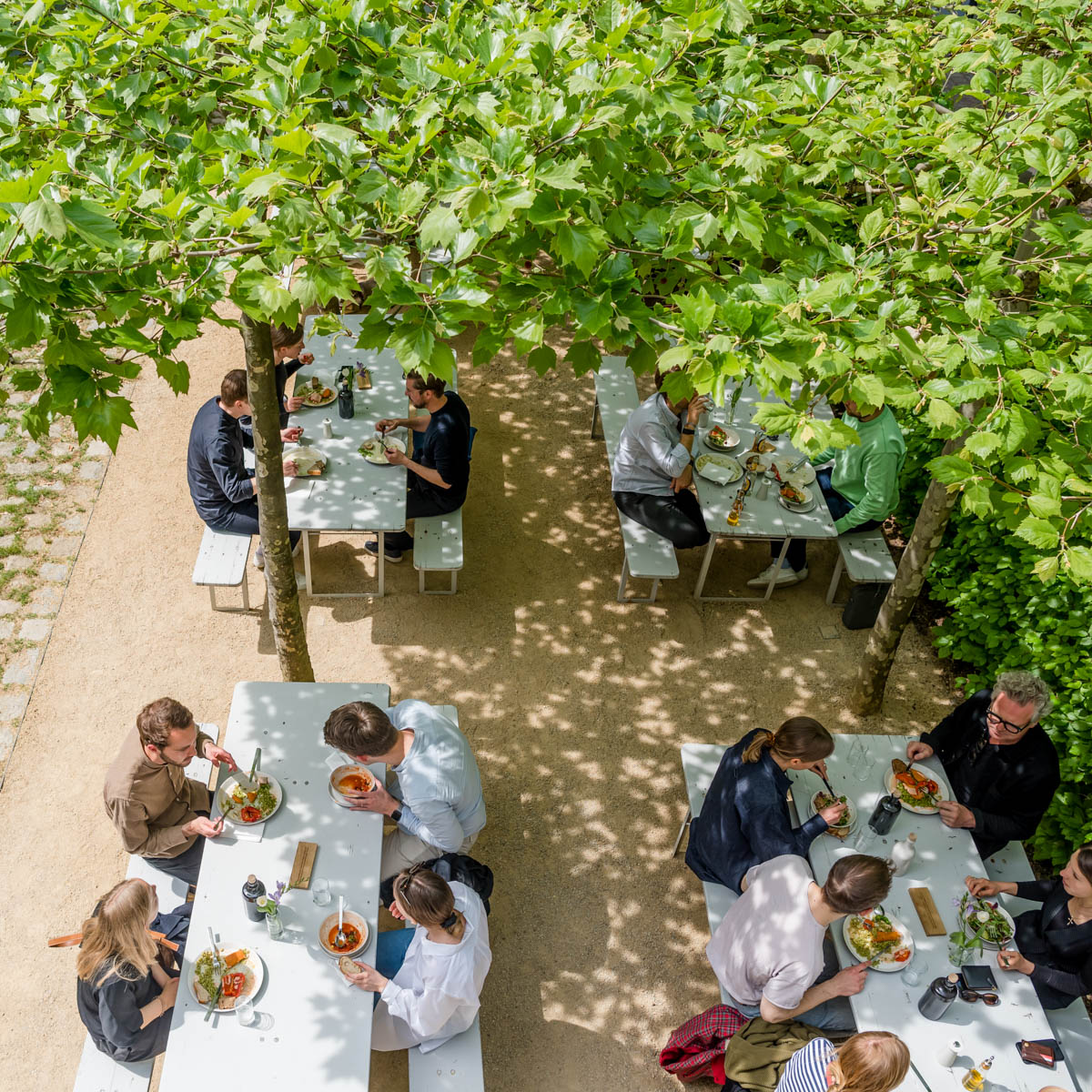 Beim Besuch im Spätsommer beschließen wir, dass sich bereits der Innenhof als einer unserer neuen Favoriten für Lunch im Grünen qualifiziert. Mit kaum mehr Geräusch als dem Rauschen der Blätter und dem Klappern aus der Küche sitzt es sich herrlich entspannt unter jungen Platanen.