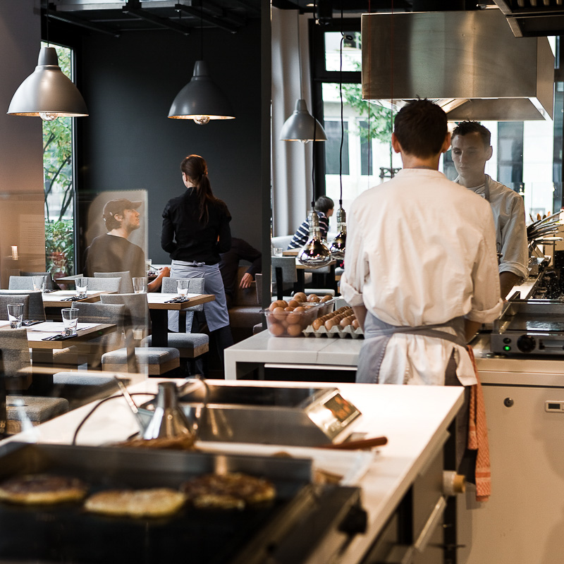 Bereits vor vier Jahren ist das Restaurant Chipps direkt gegenüber des Auswärtigen Amtes eröffnet worden. Gestern war ich endlich einmal dort, um es mir anzusehen. Inmitten moderner Neubauten erstrahlt das Restaurant bei Nacht ähnlich wie auf Edward Hoppers wohl bekanntestem Ölgemälde "Nighthawks" auf der Ecke Jägerstraße. Doch anders als bei Hopper dominiert an Stelle des umlaufenden, Einsamkeit symbolisierenden Tresens im Chipps eine gesellige offene Küche den Raum.