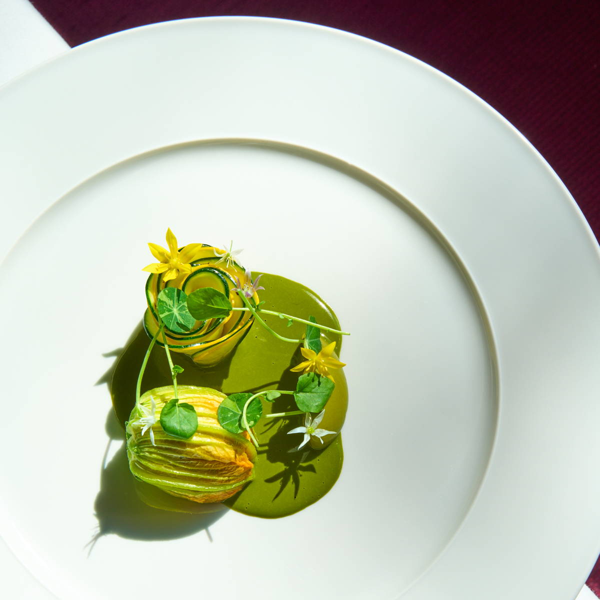 Ganz besonders begeistert uns später die Zucchini: Einmal roh mariniert, einmal zur Rose gedreht und mit Olivenöl, grünem Pfeffer und Zitronenzeste mariniert. Die Blüte der Zucchini ist mit Ratatouille gefüllt. Dazu gibt es eine Brokkoli-Creme und Beurre blanc mit grünem Pfeffer. Kapuzinerkresse, Amaranth und Knoblauchblüte bringt alles harmonisch zusammen. Wirklich großartig!
