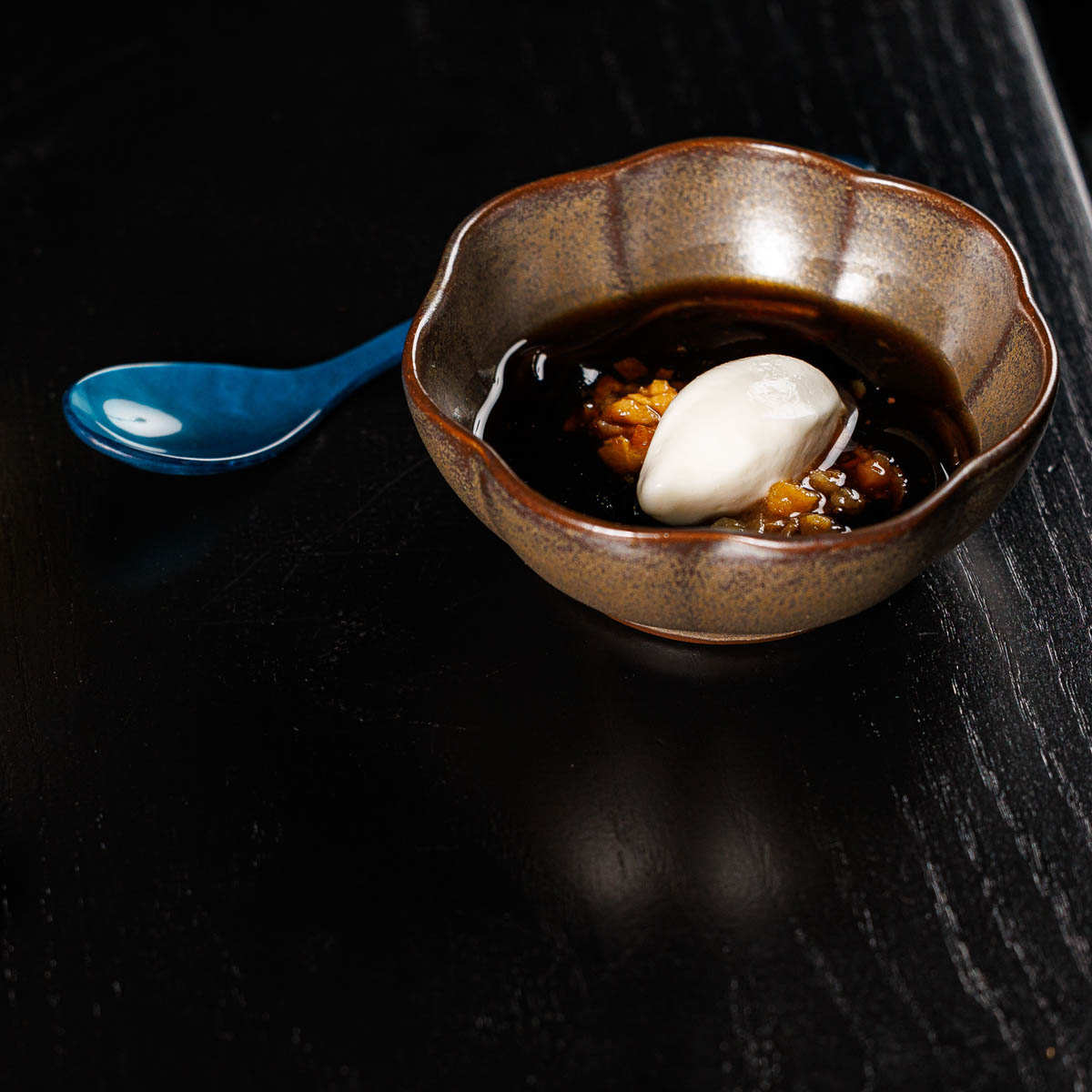 Ganz besonders begeistern die vegetarischen Gänge. Wenn beispielsweise aus einem Döschen mit Karotte, Buchweizen und Ponzu zarter Kirschholzrauch aufsteigt und dann die Komponenten im Mund zusammenkommen, ist alles gut. Nichts lenkt mehr ab und einen Moment lang wird es ganz friedlich, so beglückend fühlt es sich an.