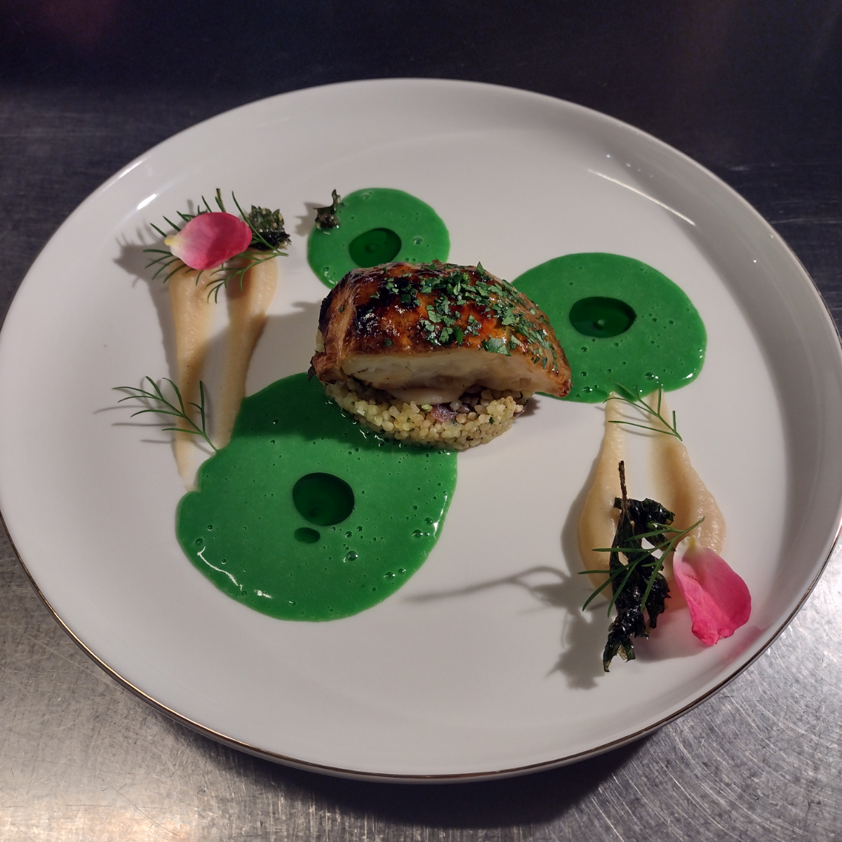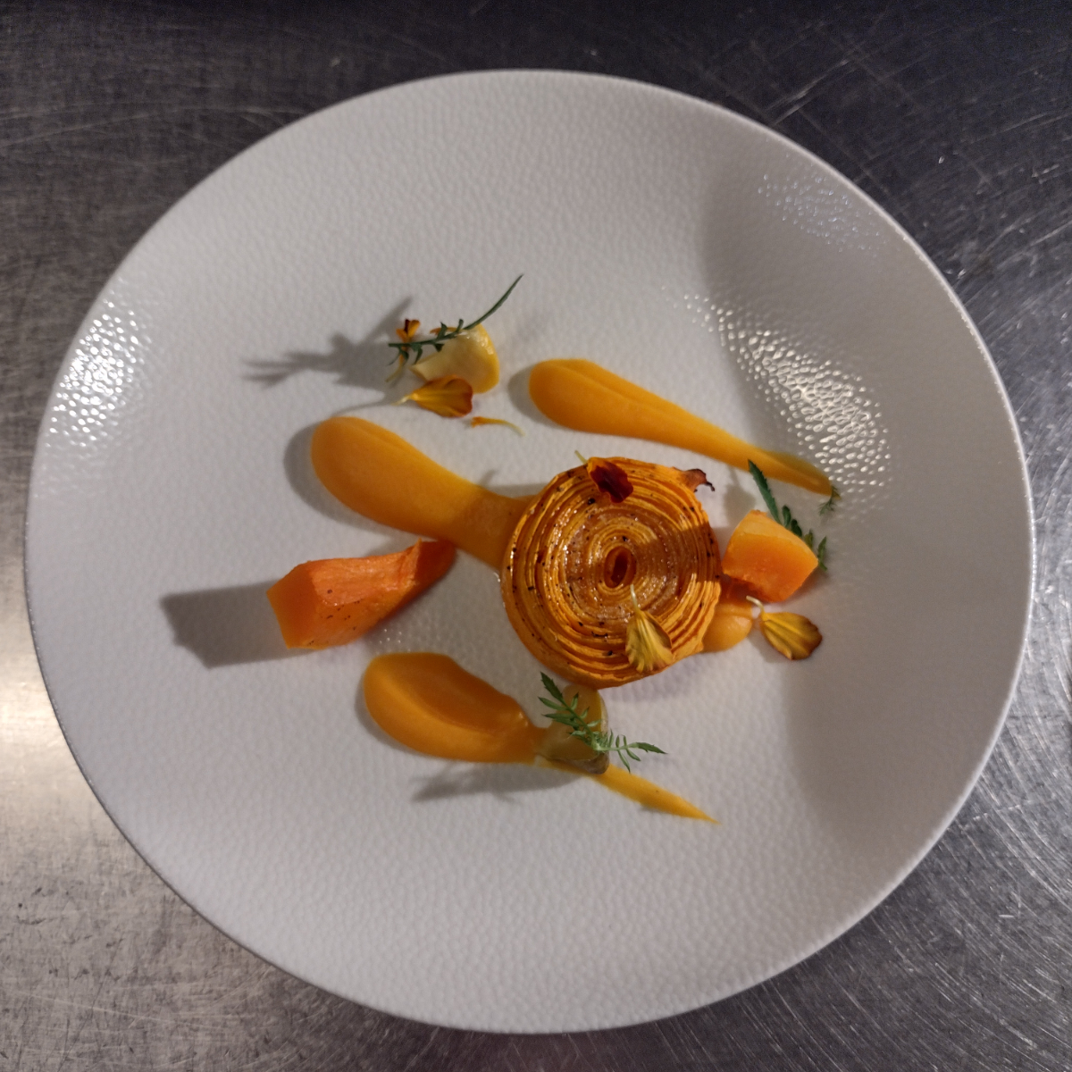 Bereits das Amuse Geule ist ein Bild von einem Teller, es überrasch mit einer würzigen Mousse aus Karotte und Ingwer, dessen gewohnte Erscheinung durch weiße Rübe imitiert wird.