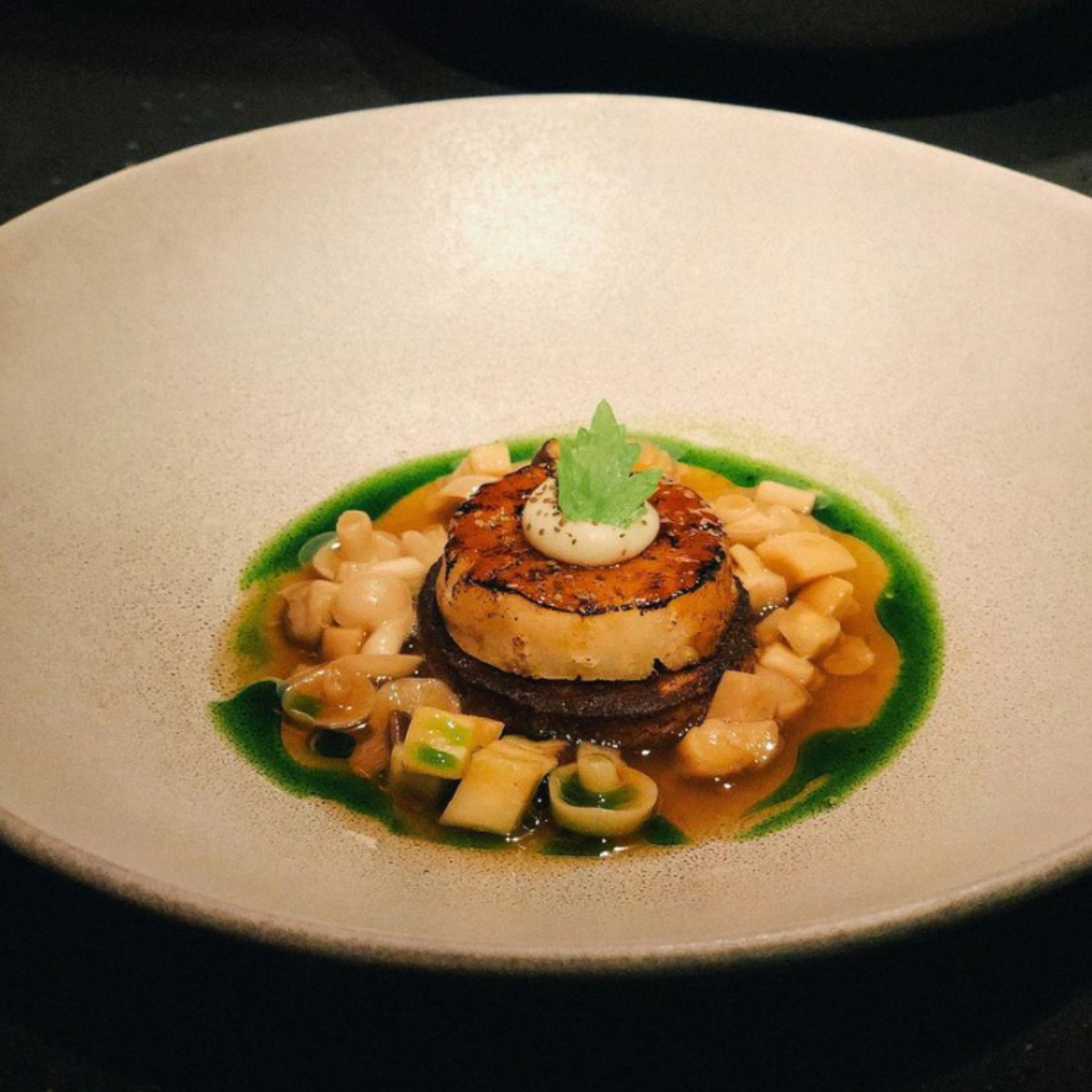 Im ersten Gang erwartet uns eine gefüllte Spitzpaprika mit Ajvar-Mayonnaise, geräuchertem Paprikasud und Kräuteröl. Die Süße und Bitterstoffe der Paprika in Verbindung mit einer Füllung aus Pilzen, Paprika und Erbsenprotein macht das Gericht sehr behaglich und comfy. Dazu tragen auch die Raucharomen des Paprikasuds bei, die Chefkoch Christopher aus gegrillten Paprikaabschnitten mitsamt Kernen gewinnt. Dieses Zero Waste Gericht macht rundum zufrieden, auch weil die Fleischigkeit des Gerichts durch den Grenache Blanc vom Weingut Idle Cellars aus Kalifornien, der in Sherry-Fässern nachreift, wunderbar aufgegriffen wird.