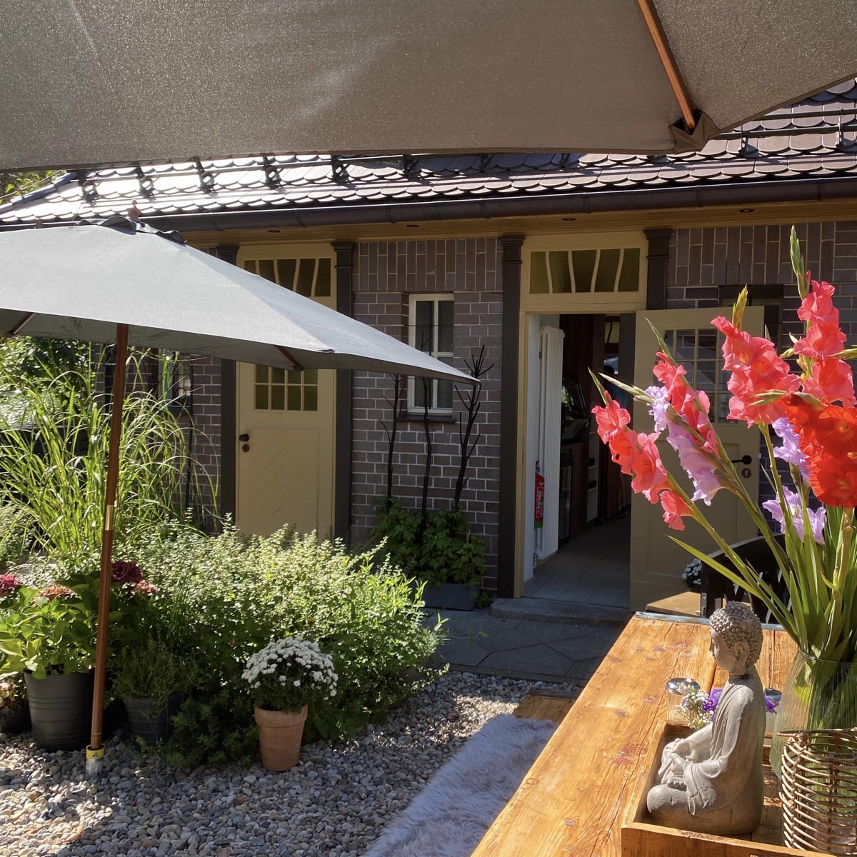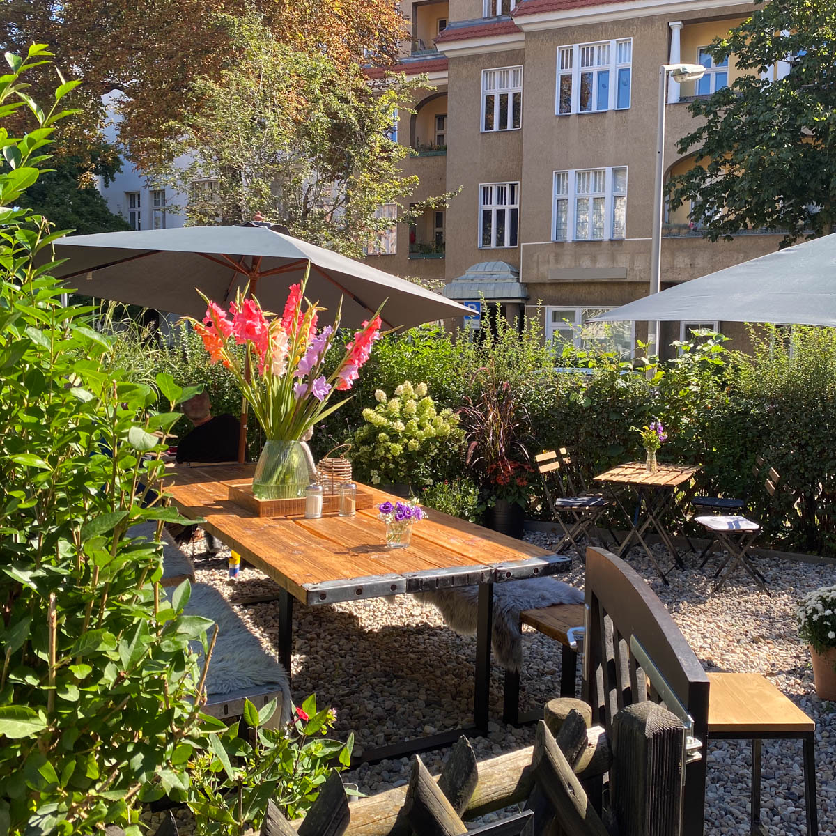 Der Garten wurde mit tatkräftiger Unterstützung von Mutter Heike zu dem, was er heute ist: ein malerischer Ort mit wunderschön arrangierten Pflanzen und klassischen Gartentischen unter dunklen Sonnenschirmen. Sechs Tonnen Kies haben sie aufgeschüttet und mit professionellem Auge – die Eltern haben nur wenige Meter entfernt ein Blumengeschäft – bepflanzt.
