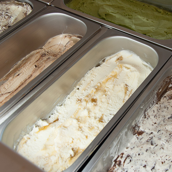 Der Blick in die Vitrine lässt mich verzweifeln. Alles klingt so großartig: 'Kaktusfeige-Ingwer' und 'Apfel-Kamillenblüte' reihen sich an 'Birne-Ingwer' und 'Gelbe Pflaume-Grieß'. Sie wetteifern mit Klassikern von Erdbeere bis Vanille und machen mir die Entscheidung schier unmöglich. Ein kleines Löffelchen hiervon, ein kleines Löffelchen davon. Wunderbar! Am Ende verlasse ich diesen Himmel für Eisfans mit einer Kugel verführerisch dunkler 'Valrhona Schokolade' und einer pistaziengrünen Kugel 'Ube'.