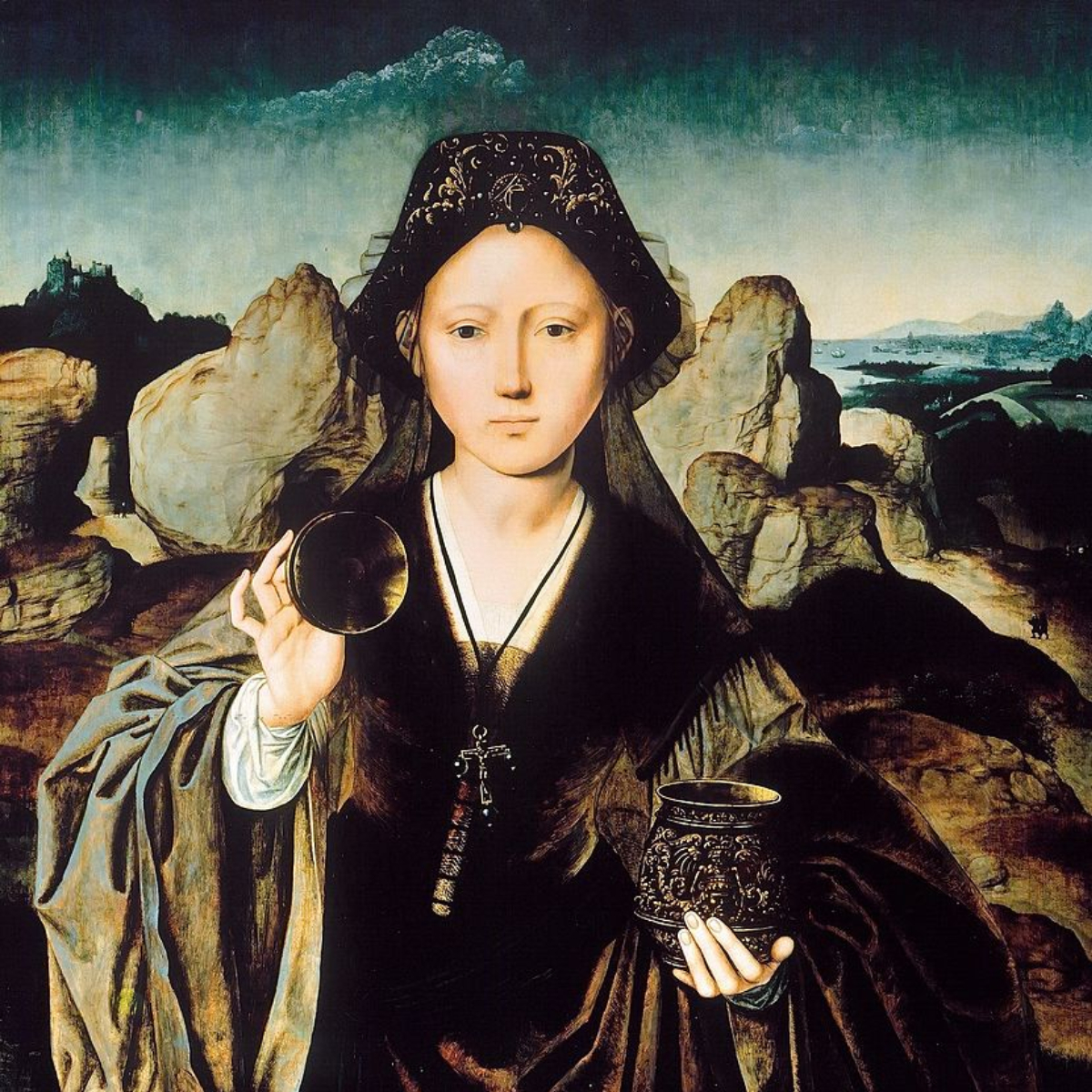 Wenn wir uns nun die Darstellung der Maria Magdalena des unbekannten Meisters ansehen, fällt uns nicht nur ihr ordentliches hinter einer Haube verstecktes Haar auf, sondern der ganz offensichtlich leere Salbentiegel, den sie in der Hand hält.