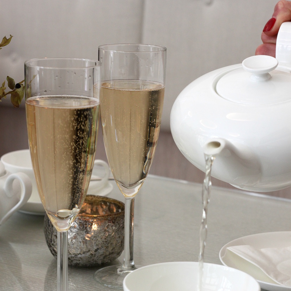 Wir werden herzlich empfangen und nehmen inmitten warmer Cremetöne Platz. Herrlich prickelnder Champagner wird gereicht und wenige Minuten später die mehrstöckige Etagere, deren Anblick uns bereits das Wasser im Munde zusammenlaufen lässt. Wir beginnen passend zum Champagner mit den herzhaften Petit Fours: mit Champignon-Frischkäse-Creme gefüllte Eclairs oder auch Pumpernickel-Sandwiches mit Schnittlauchquark, Spreewaldgürkchen und Leinöl aus der Region.