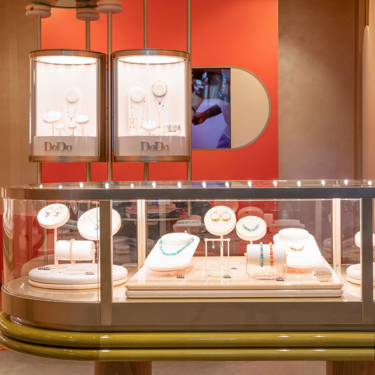 Die neue DoDo-Boutique präsentiert sich hier mit einem fließenden Raumkonzept ohne Ecken und Kanten, dafür mit großen kreisförmigen Vitrinen, das die Einzigartigkeit der Schmuckstücke unterstreicht. Glitterwände in Cremefarben, viel Puderrosa, hier und dort kontrastiert mit korallenfarbenen Akzenten schaffen eine gleichermaßen warme wie gemütliche Atmosphäre.