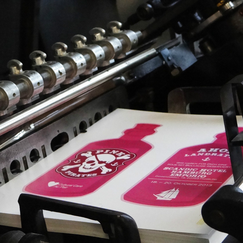 Offsetdruck, haptisch zu erlebenden Buchdruck oder Thermoreliefdruck. Private Drucksachen, wie individuelle Karten zu familiären Anlässen oder Geschäftsdrucksachen von der Visitenkarte bis hin zur Kundenzeitschrift. Bücher in Kleinauflagen oder palettenweise Vorlesungsverzeichnisse. Dabei wird je nach Bedarf industriell gefertigt oder in liebevoller Handarbeit produziert. “Wir bekleben auch mal 1000 Einladungen mit Federn”, erfahre ich.