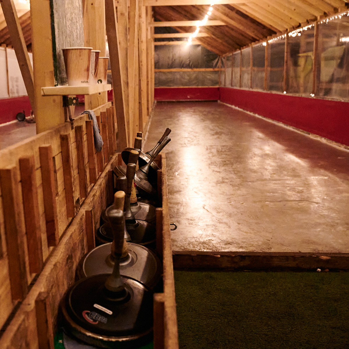 Statt auf Kunststoffbahnen setzt man im Café am Neuen See ganz bewusst auf echtes Eis, denn das rutscht viel besser. Und der Strom zur Eisaufbereitung stammt aus erneuerbaren Energiequellen, damit sich das Ganze doppelt gut anfühlt. Zudem sind die Bahnen wetterfest überdacht; Schnee und Regen stören das Spiel folglich nicht. Die Anleitung übernehmen Eisstockexperten, Eisstöcke werden gestellt.