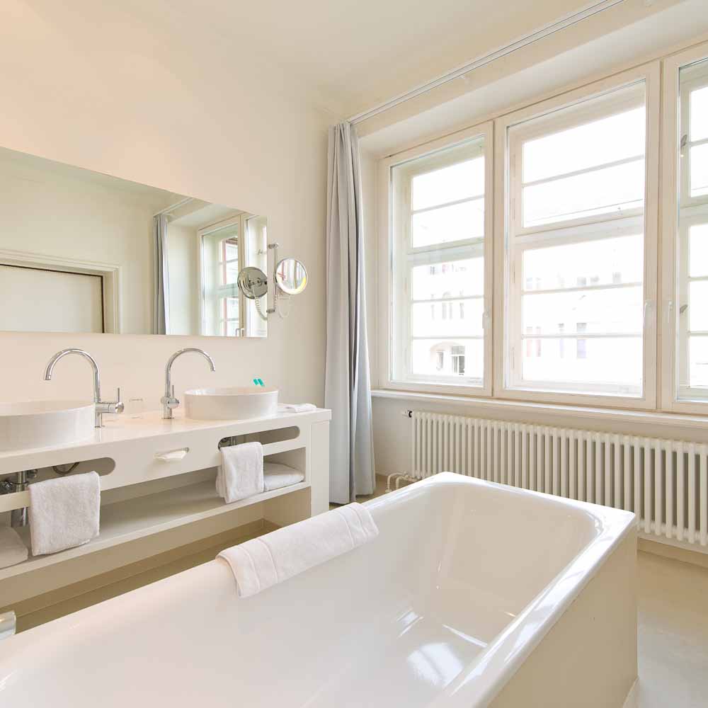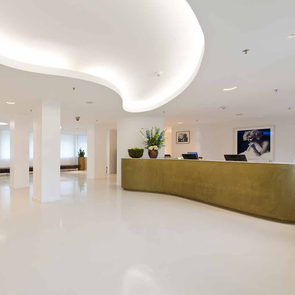 Die langgezogene, sanierte Natursteinfassade setzt sich wohltuend markant von ihrer Umgebung ab und verströmt, ebenso wie das Foyer mit seinen in Messing gefassten Glastüren, ein wenig vom Flair der Goldenen Zwanziger. Dahinter erwartet uns ein moderner, vornehmlich in hellen Farbtönen gehaltener Chic.