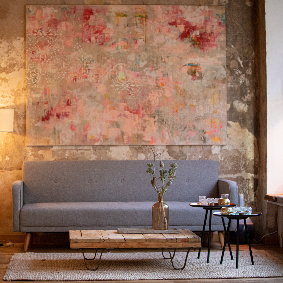 Liebevoll wurden die Wände von zahllosen Tapetenschichten befreit und die freigelegten alten Anstriche zum Teil behutsam aufgefrischt. Sie versprühen einen morbiden Charme, wie man ihn sonst nur im Süden findet. Dazu wurden, als könnte es gar nicht anders sein, farbenfrohe Bilder mit Stühlen aus alten DDR-Beständen und puristische Leuchten mit marokkanischen Kissen sowie jeder Menge Naturmaterialien kombiniert.