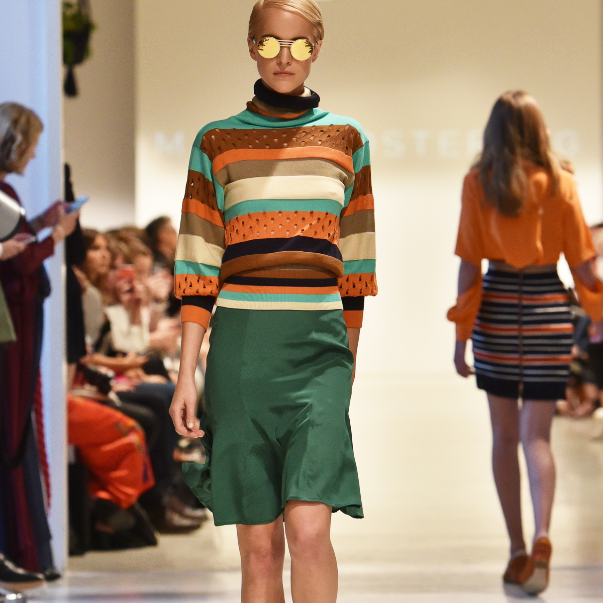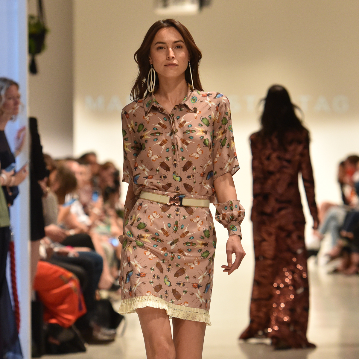Verspielt, glamourös und elegant – so ist der Stil von Ostertags neusten Kleidungsstücken. Durch Quasten-Details werden an transparenten, flatternden Kleidern Akzente gesetzt, Miniröcke werden mit Fransen verziert und mit gestreiften Strick-Kleidungsstücken in Orange, Beige und Navy kombiniert. Die Insekten-Motive sind auf eine Bomberjacke, Kleider und Hosen aus Seide und transparenten Materialien gedruckt und erzeugen ein farbenfrohes Bild.
