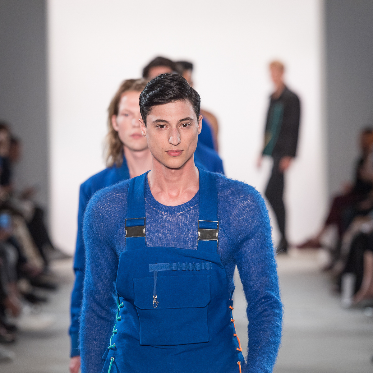 Männer tragen schmal geschnittene Overalls überwiegend in einem intensiven Kobaltblau. Schlaue Details ergänzen die uniforme Arbeitskleidung: Durch fast alle Looks ziehen sich Schnürungen mit lang herabhängenden Kordeln in knalligen Farben wie Türkis, Gelb und Orange. Kombiniert wird der neu-verfeinerte Blaumann Ton in Ton oder mit Schwarz in Form von kastig geschnittenen Jacken und langen Mänteln mit aufgesetzten Taschen.