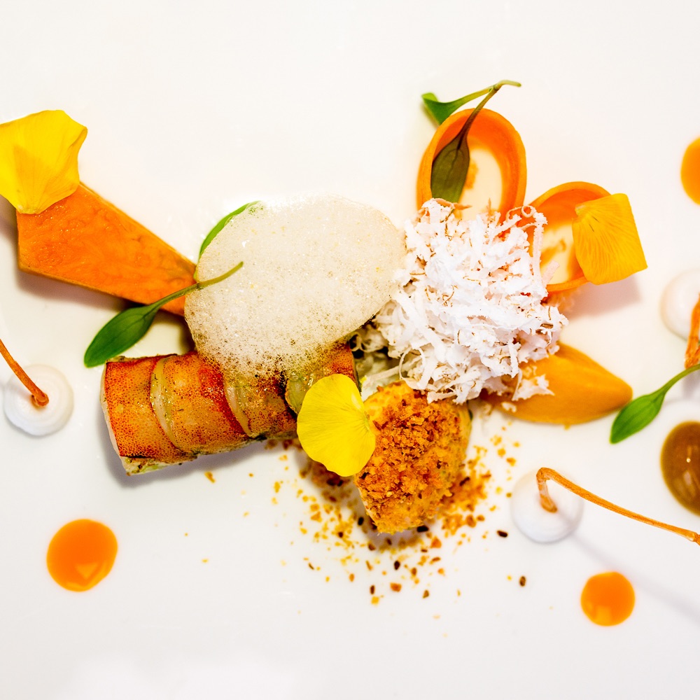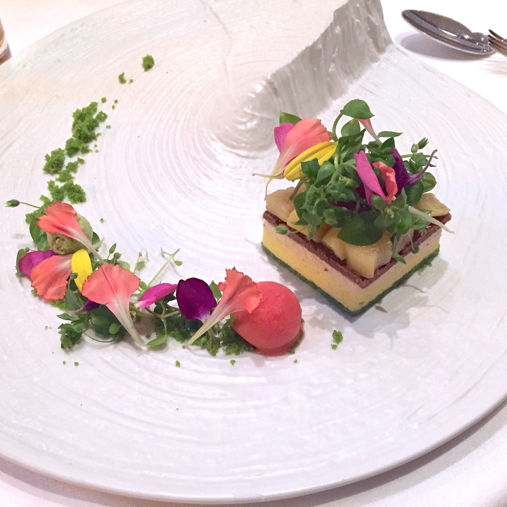 Er findet seine Fortsetzung in einem Törtchen aus sahniger Creme und Räucherfisch, mit dem der Chefkoch Matthias Diether uns ein weiteres Mal begrüßt. Es ist die perfekte Überleitung zu der Blauen Garnele mit Kürbis und Bergamotte, die den ersten Gang betitelt. Sehr schön frisch und rund! Es folgen ein Ravioli gefüllt mit Wolfsbarsch und Serrano Schinken, sowie im dritten Gang ein handgeschöpfter Frischkäse namens "Brillat Savarin" von Maître Bernard Antony mit Pata Negra und Kumquat .