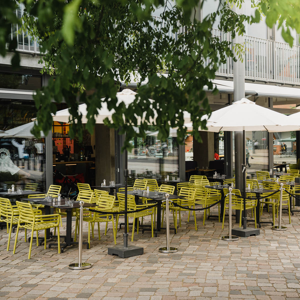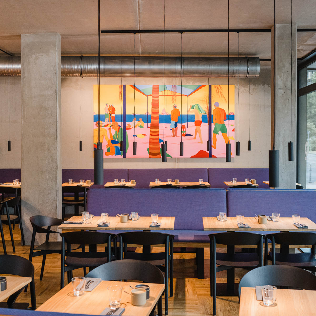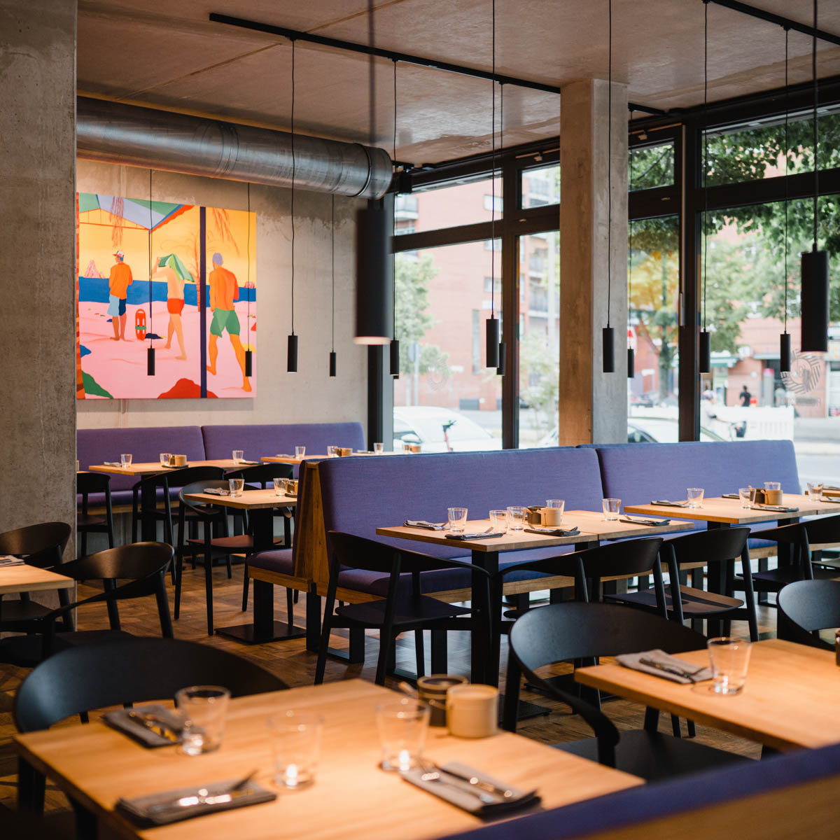 Das lichtdurchflutete Frühstücksrestaurant am Fromet-und-Moses-Mendelssohn-Platz ist zu jeder Jahreszeit ein cooler Ort. Das Interieur ist modern mit viel Beton und Kunst in kräftigen Farben. Im Sommer sitzt man mit Blick auf das Museum ganz besonders schön an den Tischen zum Platz hin.
