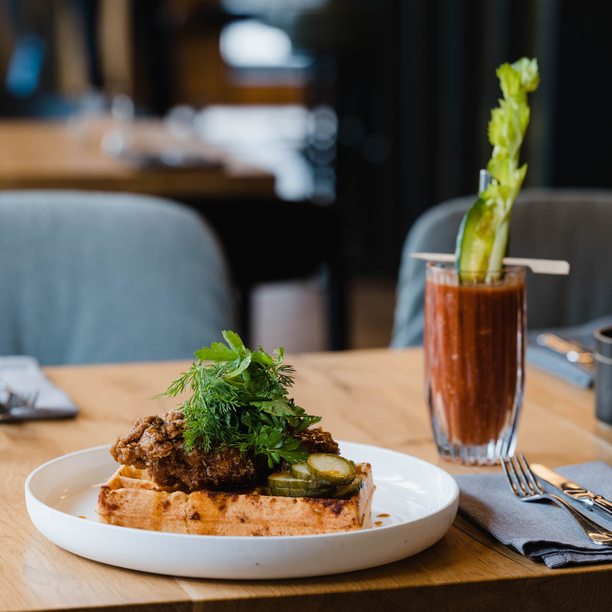 Unter weißen Sonnenschirmen genießen dann auch wir bei unserem Besuch ein edles Bauernfrühstück mit grünem Spargel und Trüffelbutter sowie das legendäre „Chicken 3000“, also Crispy Chicken auf einer Cheddarwaffel mit Chilli-Bacon-Karamell und Kräutersalat. Ein schlicht fantastisches Gericht!