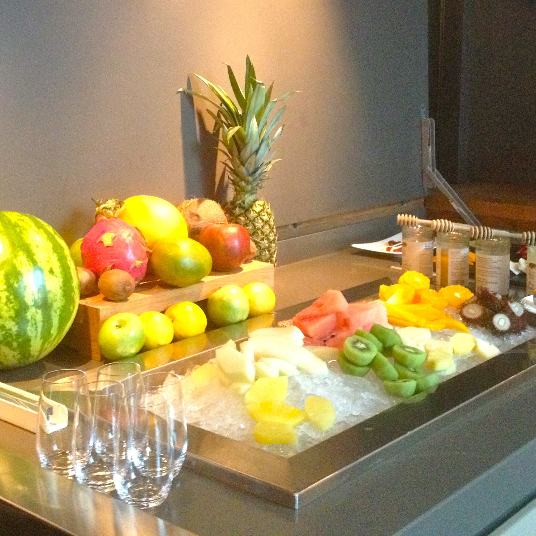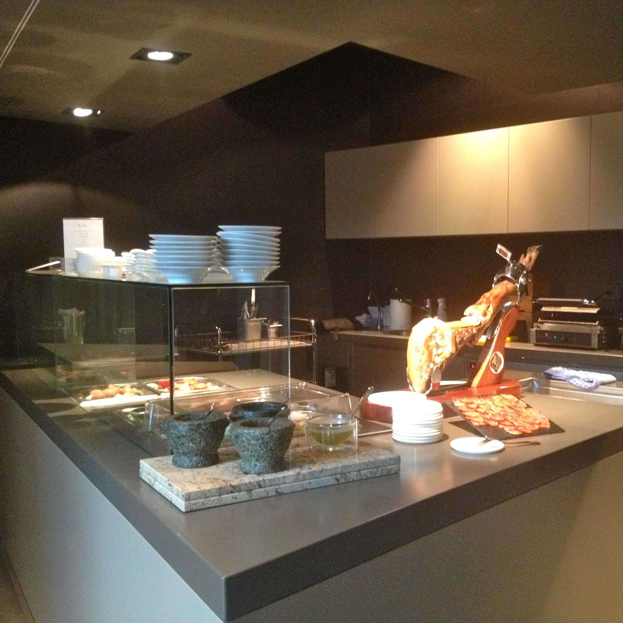 Auf Eis gekühlt warten dort beispielsweise jede Menge exotischer Früchte und frisch gepresster Säfte. Unter dem süßen Gebäck finden sich majorkinische Ensaimadas, kleine französische Mandelküchlein namens Financiers, Donuts, Apfeltaschen und und und. Natürlich gibt es Cerealien und Müsli in jeder Form, sowie Joghurt, Eierpudding und Zitronen Mousse.
