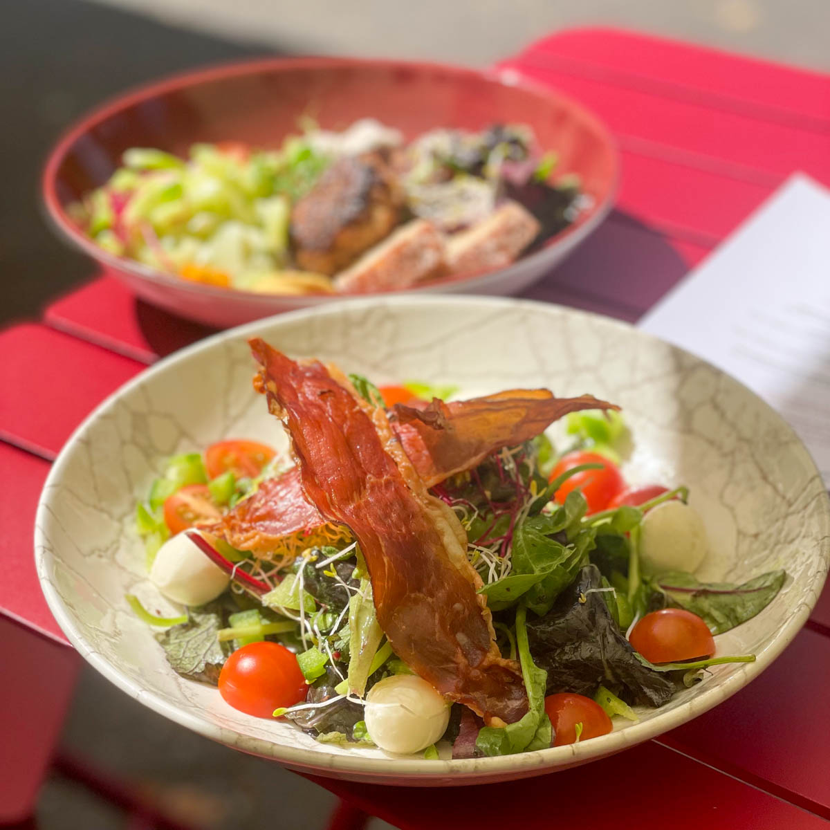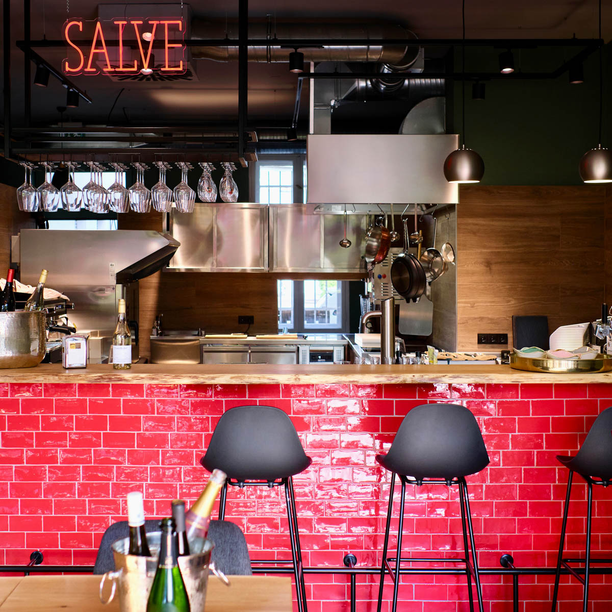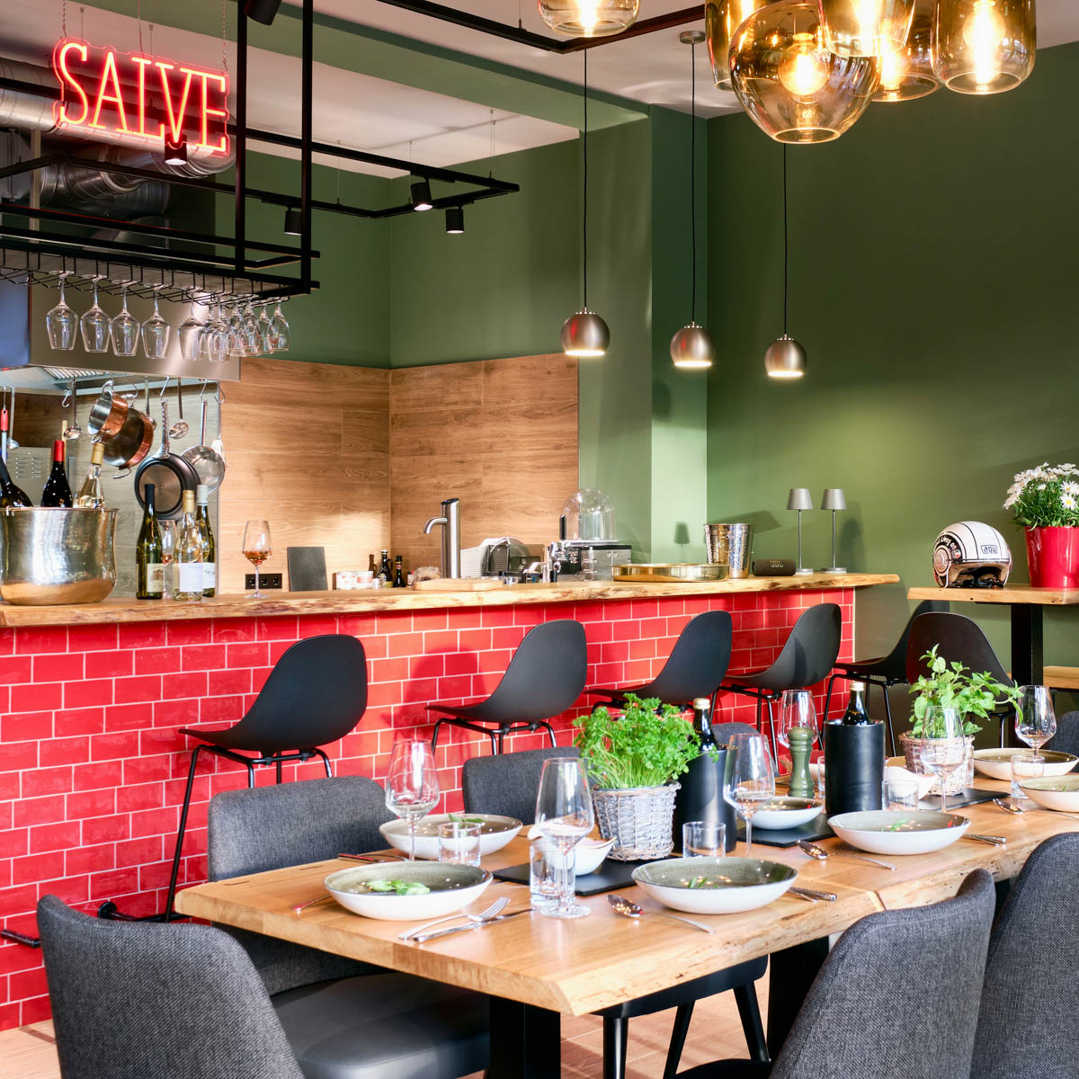 Das Interieur ist modern und clean, das Gartenmobiliar vor der Tagesbar leuchtend rot und damit eine Fortsetzung des ebenso gefliesten Tresens, über dem ein leuchtendes „Salve“ zum Eintreten lädt.