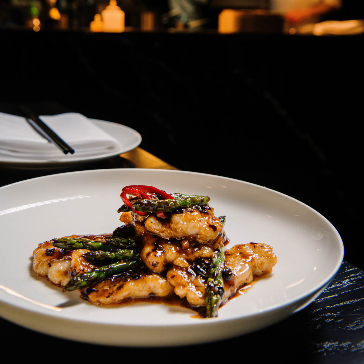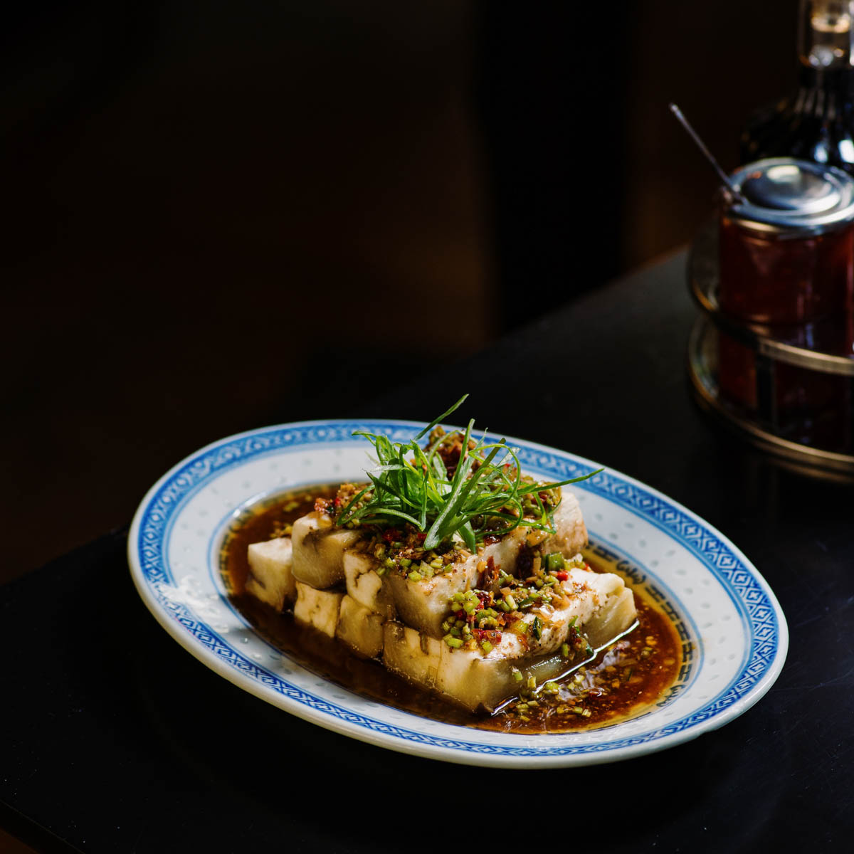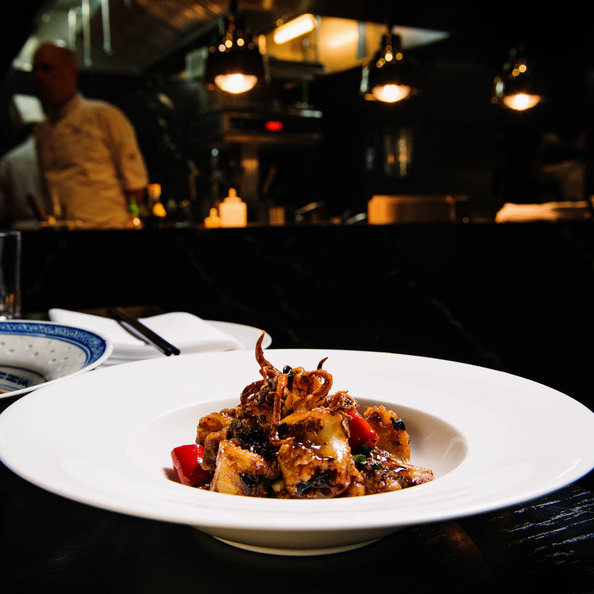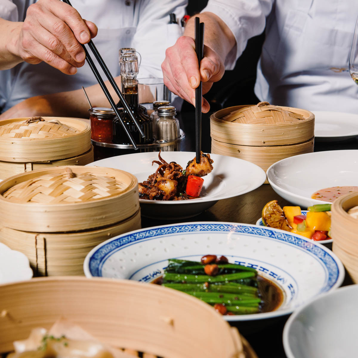 Ein Musterstück für jenes typische Aromenspiel aus salzig, süß, bitter und sauer ist die herrliche Sauer-Scharf-Suppe mit Ente und Morcheln als Einlage. Oder auch der chinesische Gurkensalat mit Sambal Oelek, Ingwer und Koriander im nächsten Gang. Zu einem wohligen Kontrast, weil milder, wird das feine Tartar vom Wolfsbarsch.