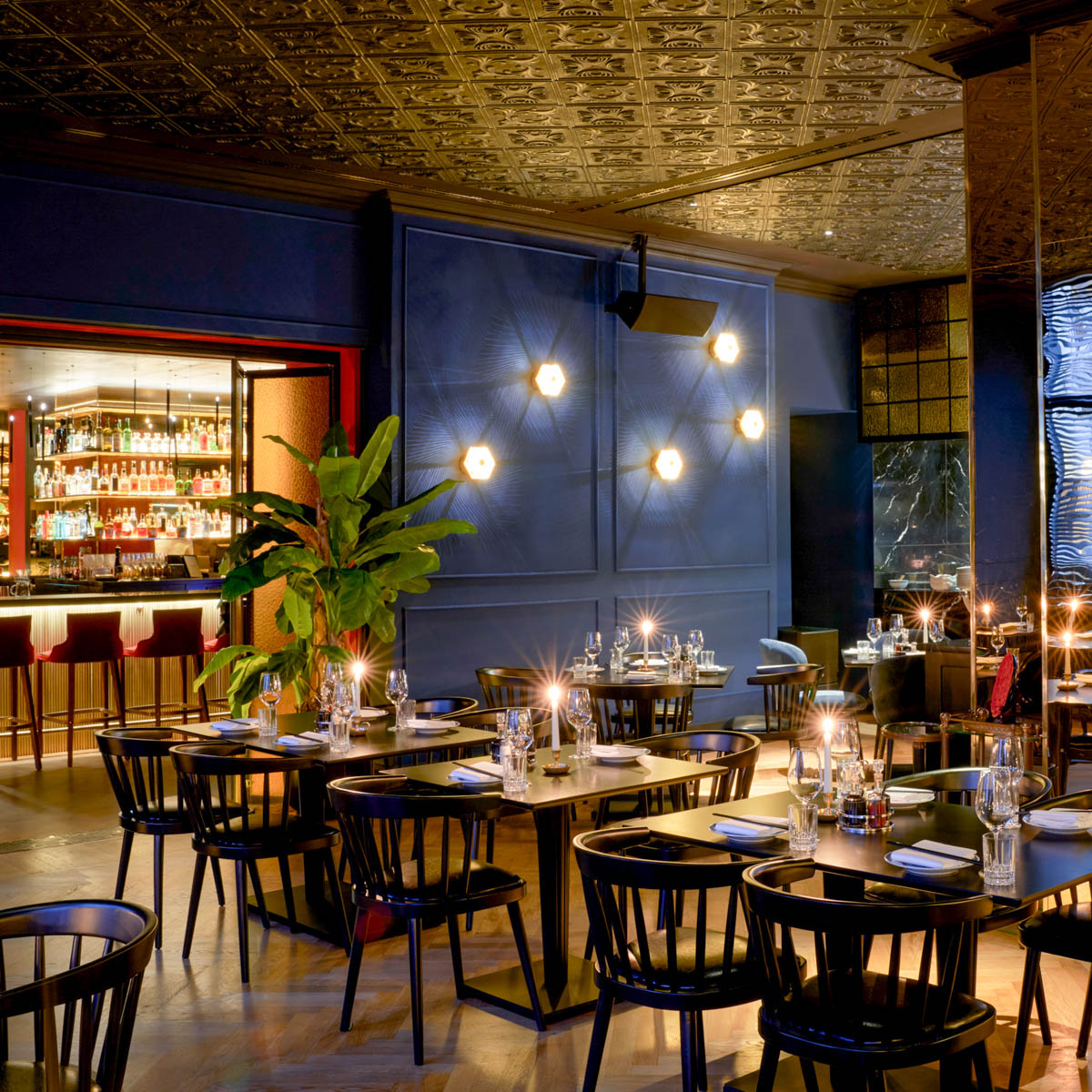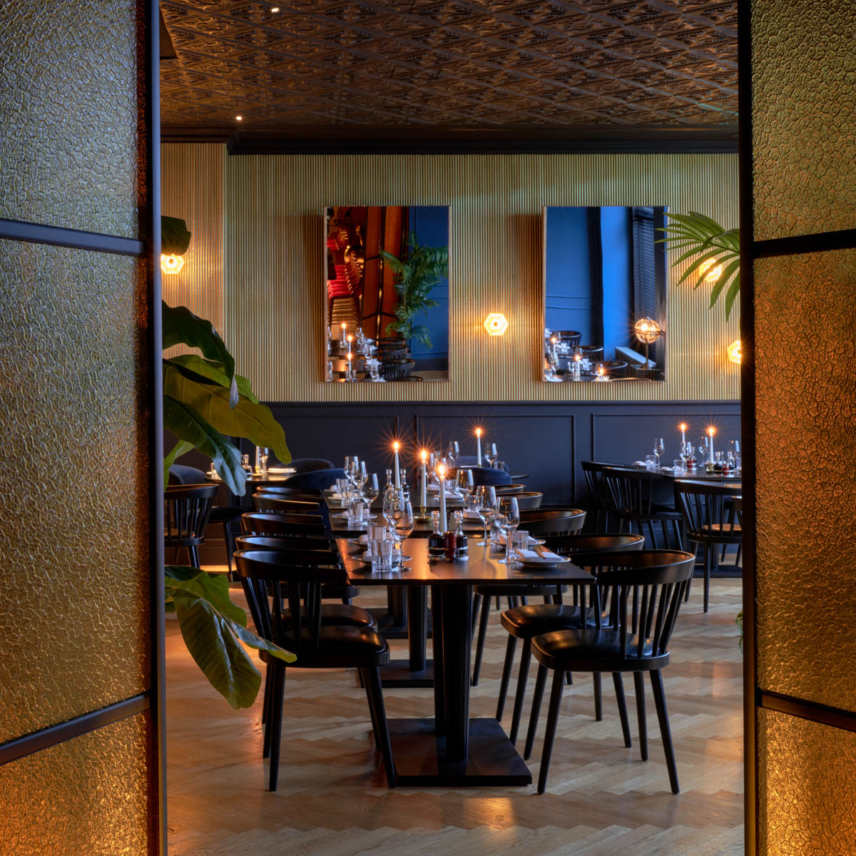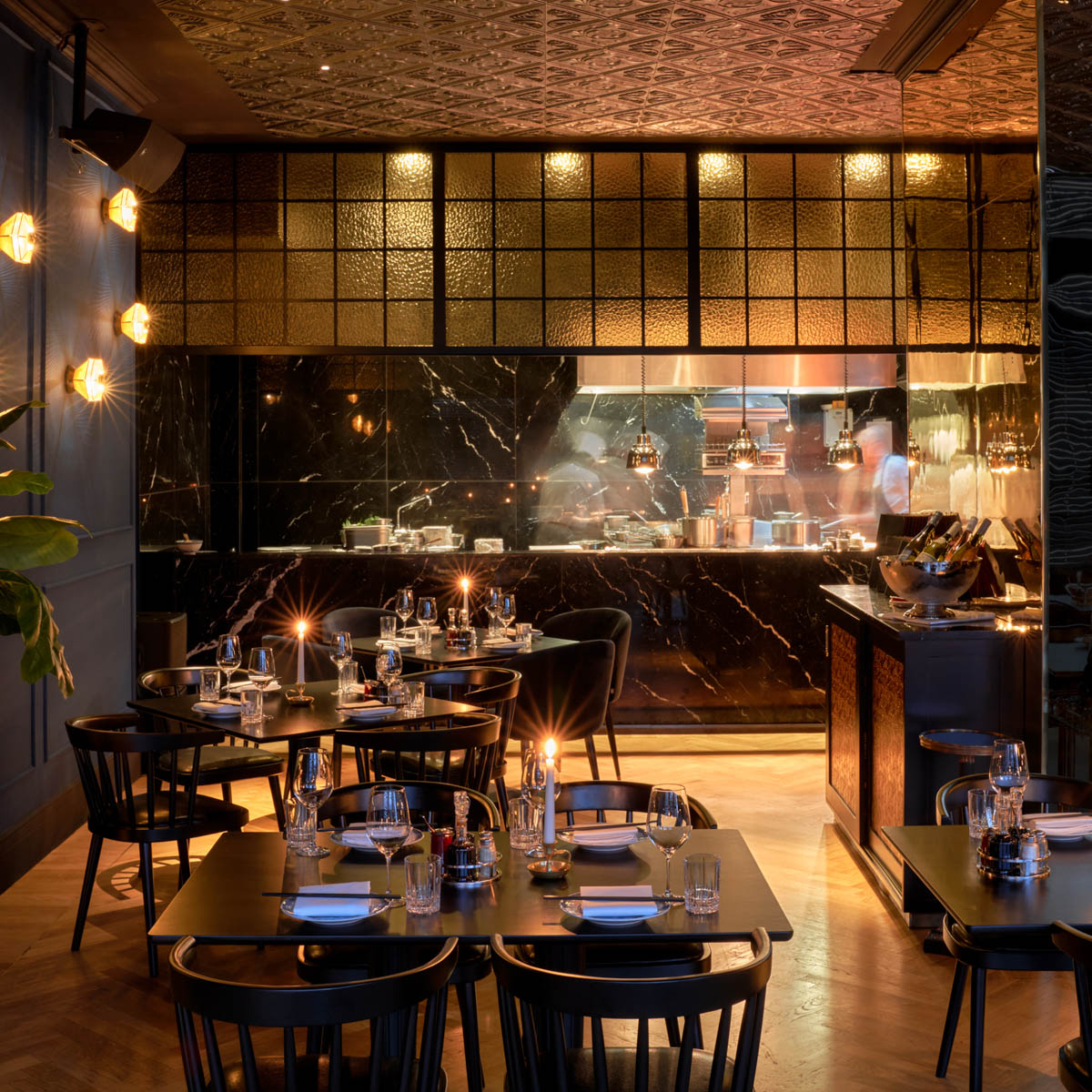 Gefühlte 1000 Lichter am Eingang des Hotel Provocateur versprechen uns einen Hauch von Dekadenz, einen Hauch von Jetset, einen glanzvollen Abend voll Sinnlichkeit. Wir betreten den Gastraum durch die prämierte Provocateur Bar, die mit viel Gold und Samtrot auf die Goldenen 20er erinnert. Das Golden Phoenix prägen hingegen viel dunkles Holz, üppige Grünpflanzen und schummriges Kerzenlicht. Ganz besonders beeindruckt uns die mit dunklem Holz getäfelte Decke – und natürlich der Blick in die offene Küche.