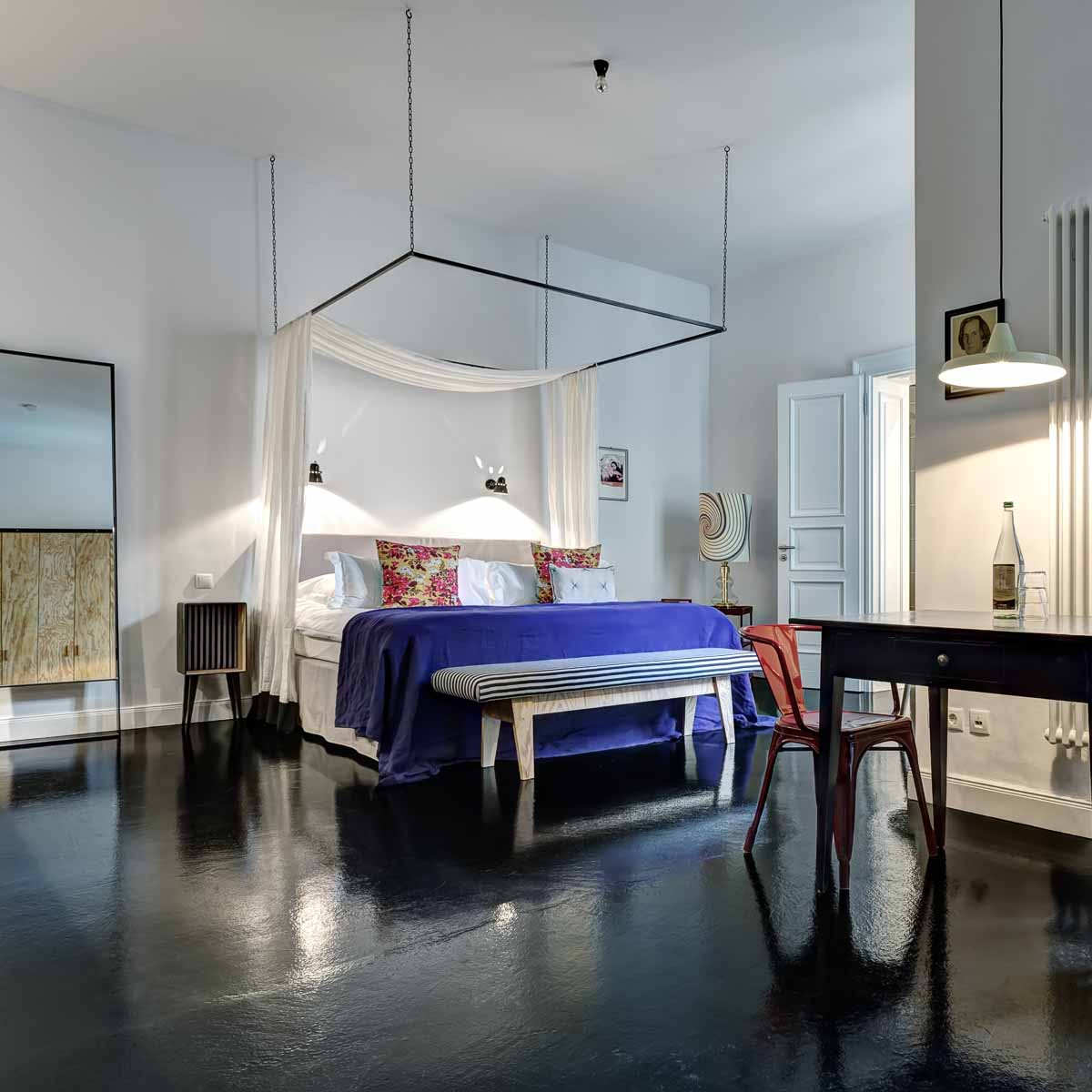 Als Hommage an die früheren Bewohner des Gebäudes wurde auf traditionelle Zimmernummern verzichtet. Stattdessen ist jedes Apartment einer fiktionalen Person wie Lea Grün oder Herr Günther zugeordnet. Wir wohnen bei Dr. Oswald. Jedes Apartment ist mit einer Türklingel und einem Briefkasten ausgestattet.