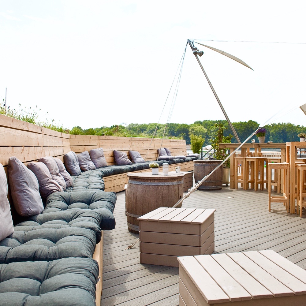 Auf hölzernen umlaufenden Bänken mit losen blauen Kissen und extra hohen Rückenlehnen kann nach Herzenslust gechillt werden. Unter weißen Sonnensegeln stehen lange hohe Tische mit schlichten Barhockern neben niedrigen entspannten Sitzgruppen rund um eine Feuerstelle. Und auch die klassischen Bierbank Garnituren fehlen nicht. Hier jedoch in stilvollem Grau und mit freiem Blick aufs Wasser und den Hafen.