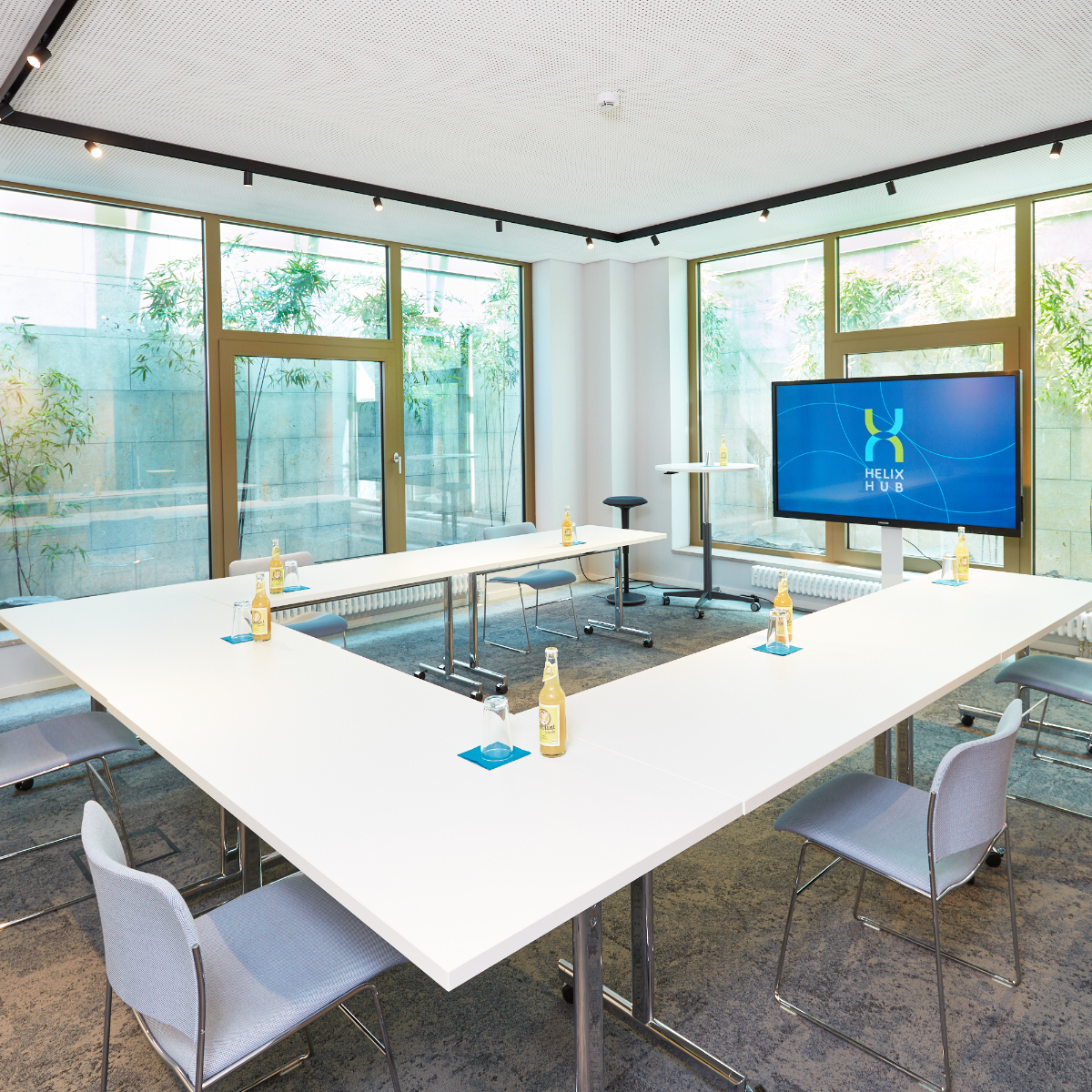 Den Meeting- und Veranstaltungsbereich kann man übrigens auch extern buchen. Der Ready-to-use-Ansatz findet hier ganz besonders sinnvoll seinen Weg in den Helix Hub. Digitale Screens sorgen dafür, dass man soeben gefundene Ideen direkt exportieren und weitersenden kann, diverse Anschlüsse für Computer-Präsentationen liegen im Helix Hub bereit, hochwertige Kameras zoomen im Videocall bei Bedarf auf die jeweils sprechende Person und hochsensible Mikrophone sorgen dafür, dass auch Menschen mit leisen Stimmen am anderen Ende der Leitung gehört werden. Natürlich gibt es überall Highspeed Wifi.