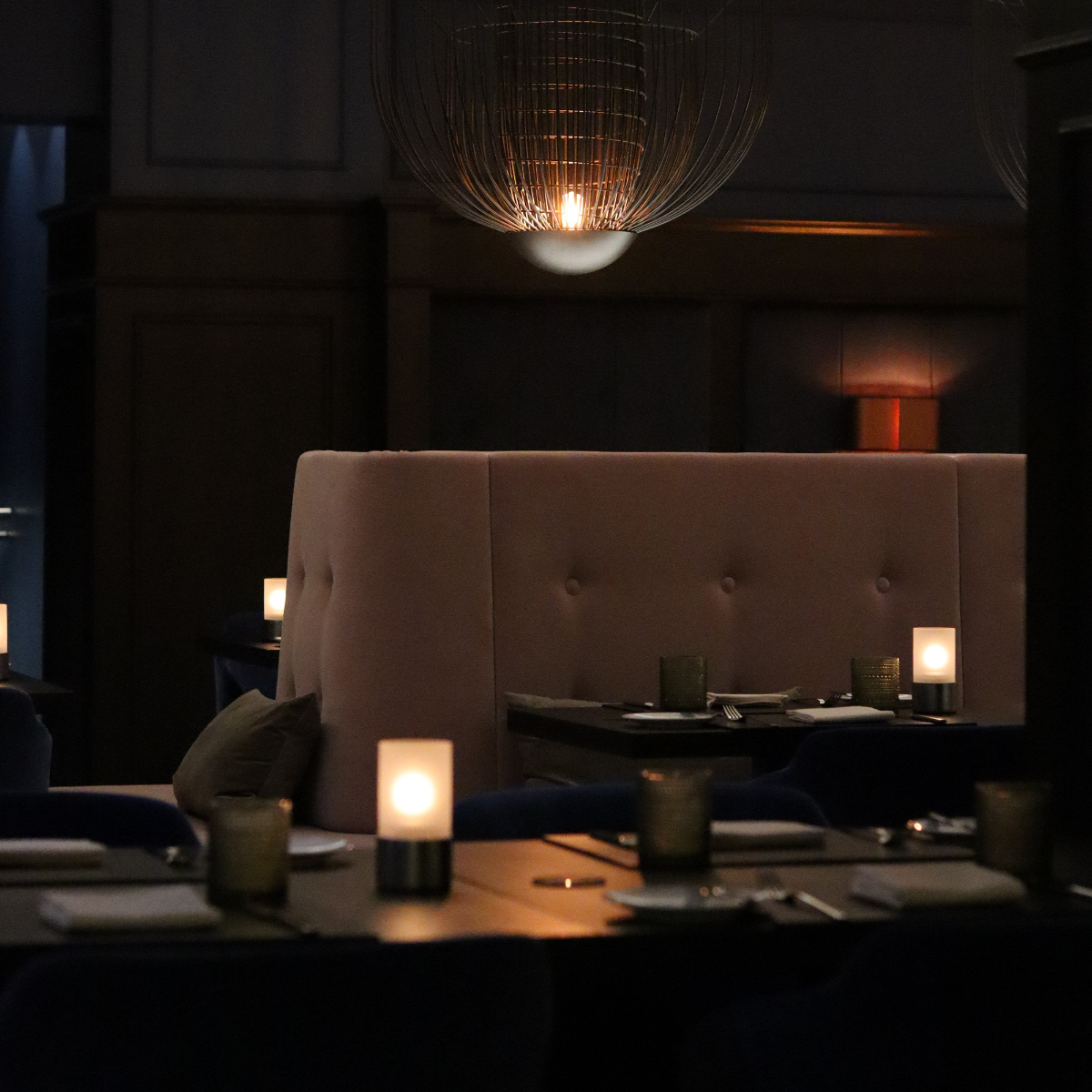 Ebenso wie die Küche, ist auch das Restaurant selbst inspiriert von Geschichte und Tradition: Dunkles Holz, zartes Rosa und intensives Blau schaffen eine angenehm ruhige Atmosphäre. Klare Linien treffen auf Samtmobiliar und sorgen für einen einzigartigen opulenten Minimalismus, der durch die tiefblauen Wände besonders gemütlich wird. Das Preußisch oder Berlinisch Blau zieht sich wie ein – nunja – blauer Faden durch das gesamte Restaurant.